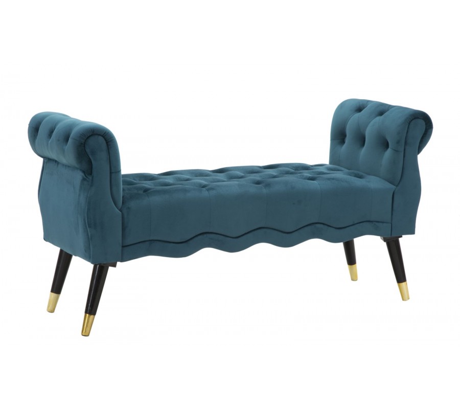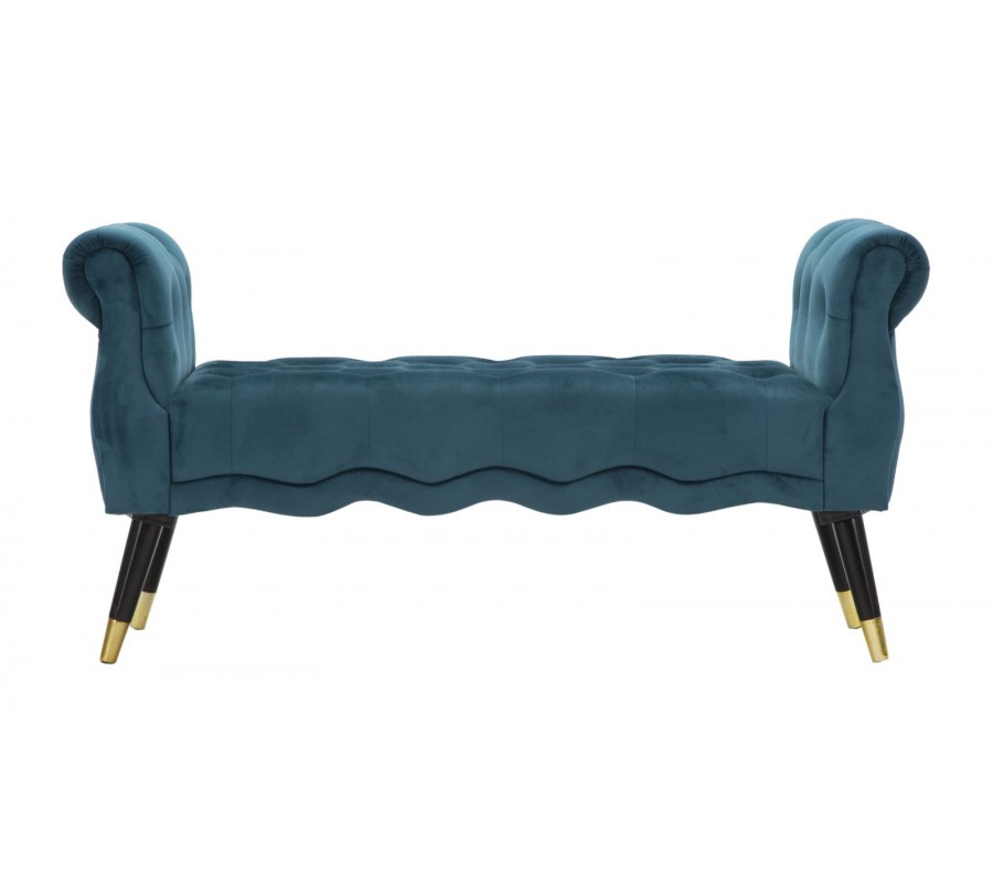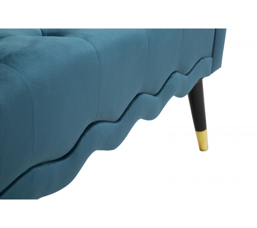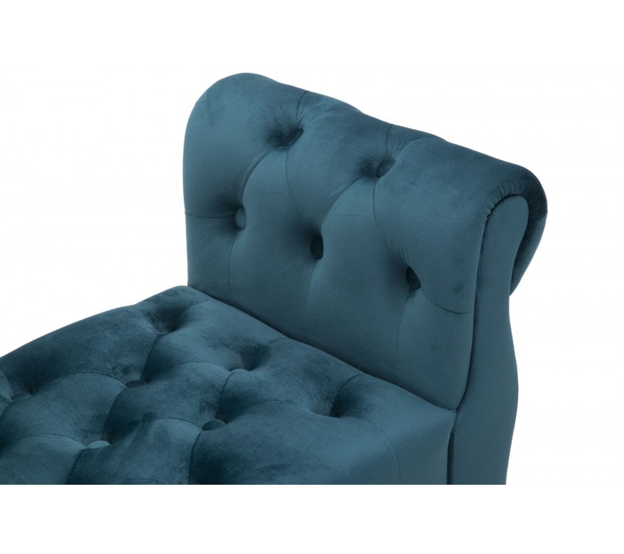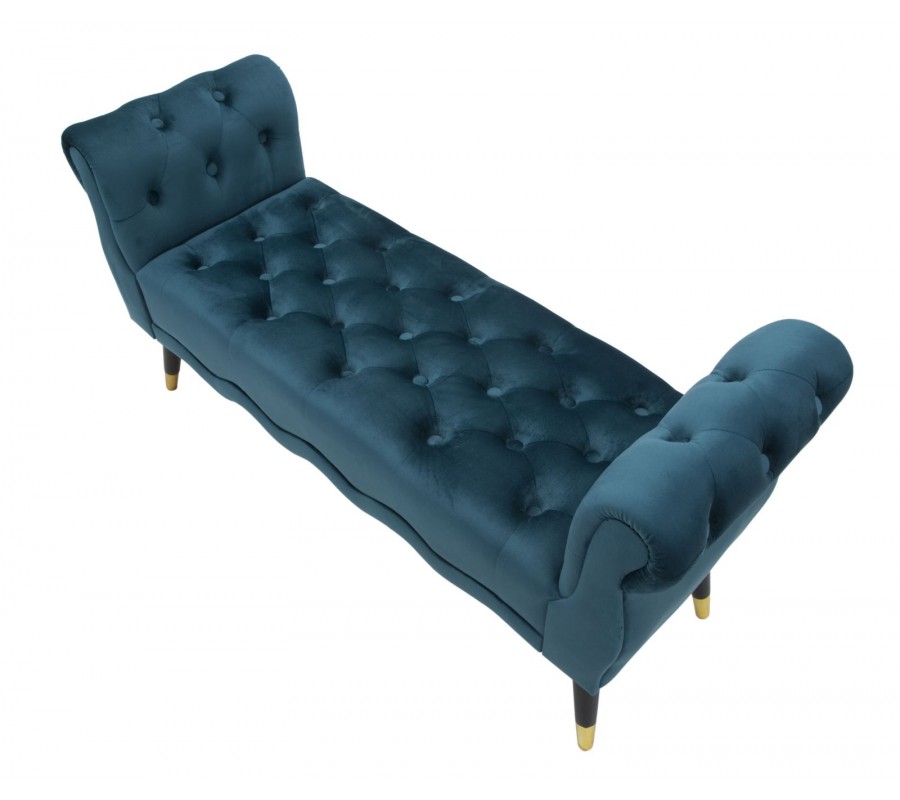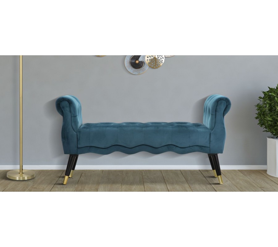Lavica má pevnú drevenú konštrukciu, ktorá je vo vrchnej časti obalená mäkkým penovým čalúnením. Pokrýva ju zamatový poťah v nádhernom tealovom odtieni modrej, ktorý v kombinácii s jemným leskom textílie pôsobí luxusným dojmom.