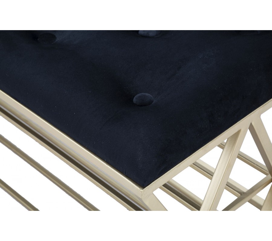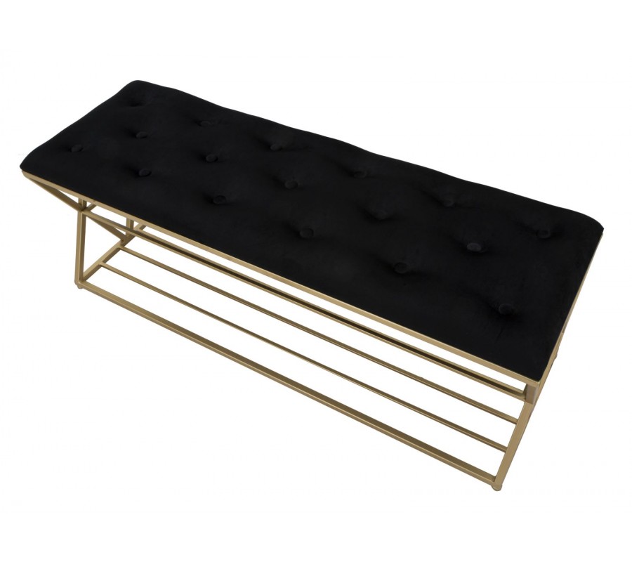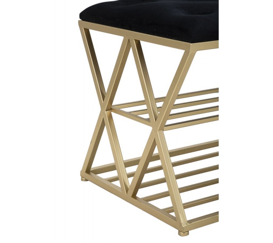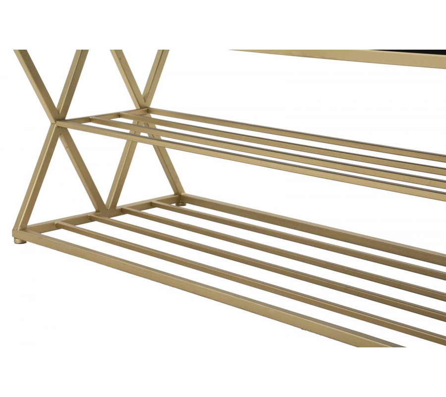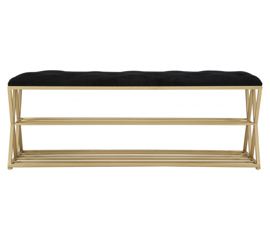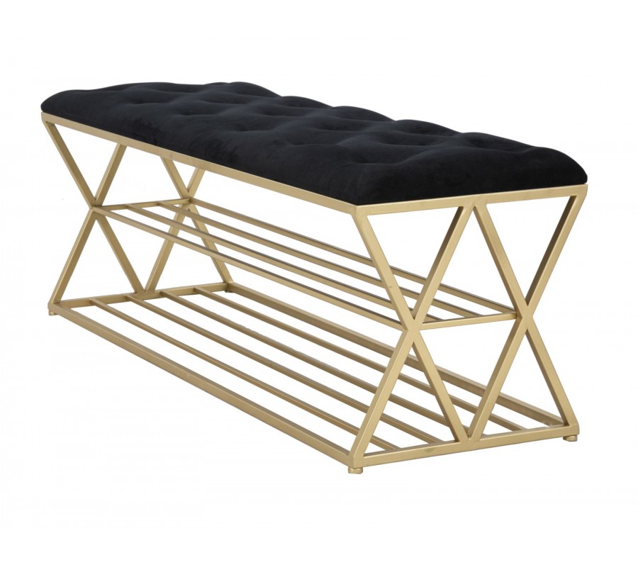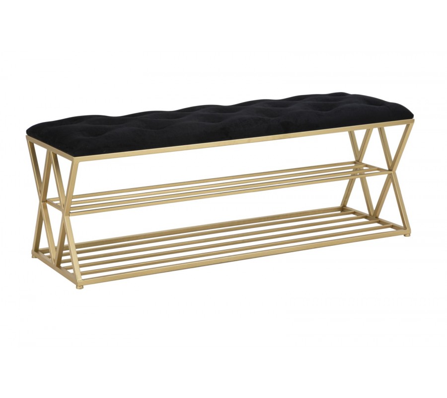 Dizajnová art deco lavica Araccia s dvomi policami na topánky v zlatej farbe s čiernym zamatovým čalúnením 120 cm