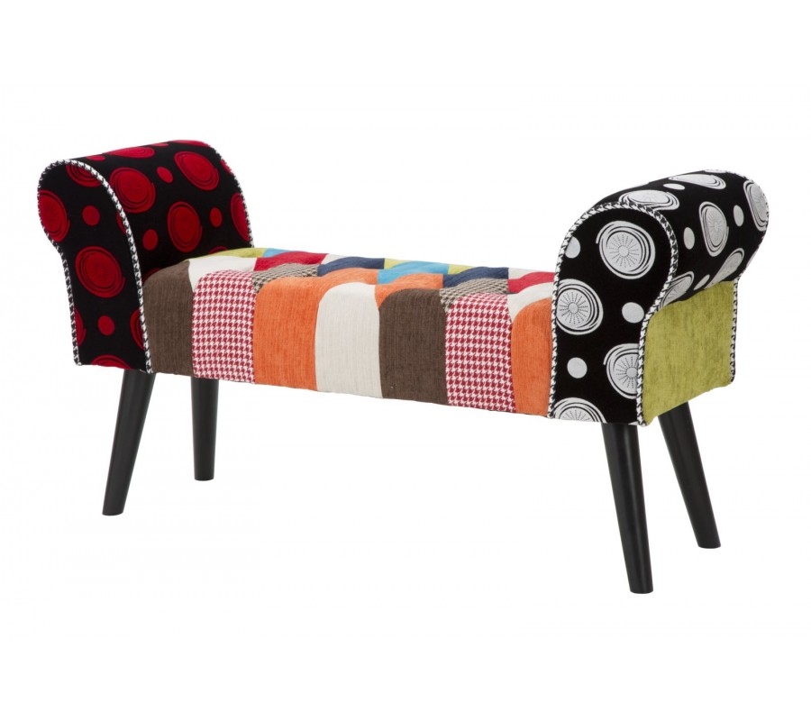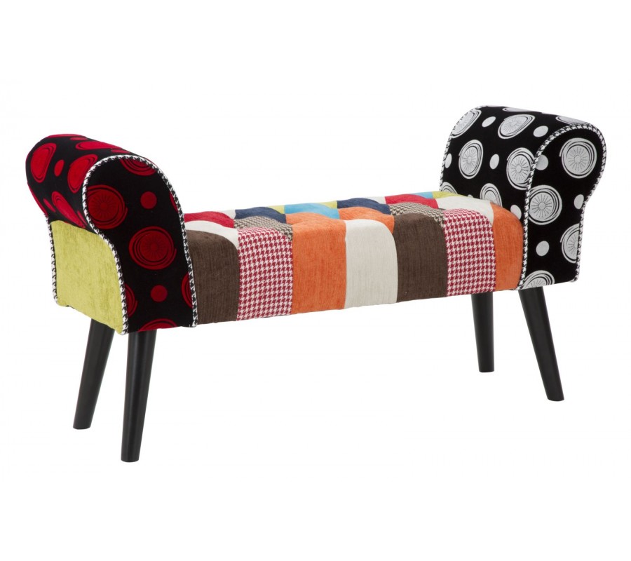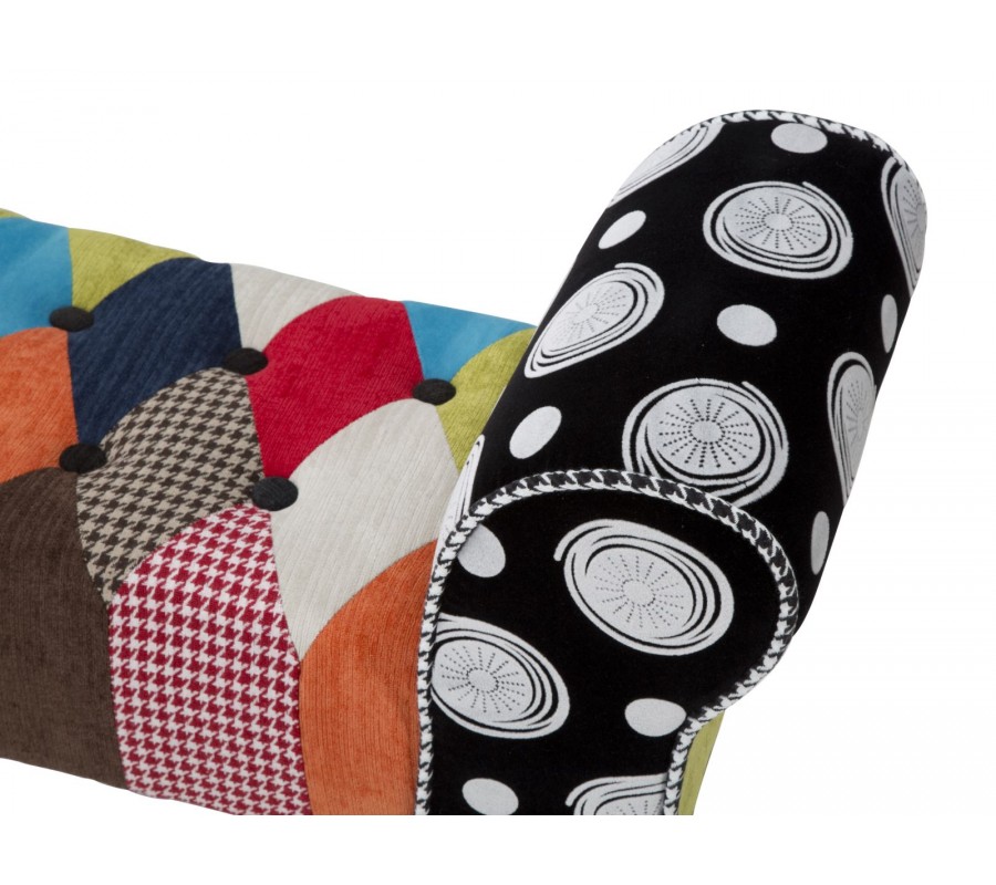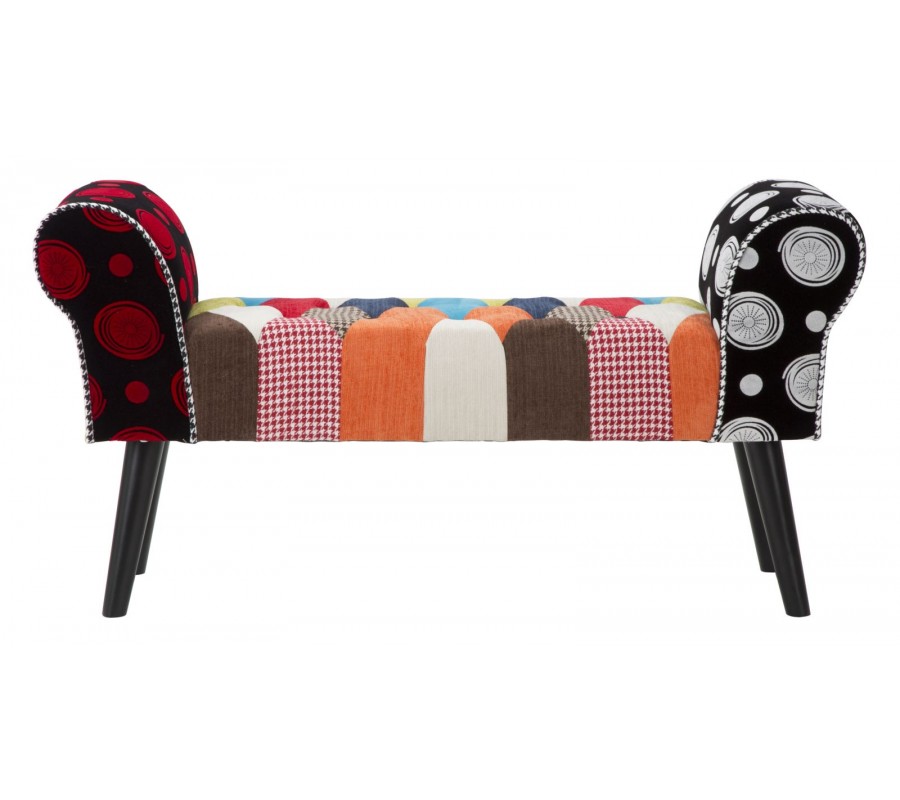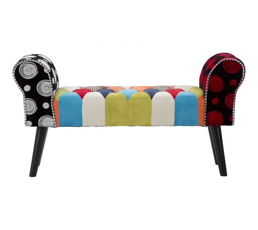 Lavica má pevnú drevenú konštrukciu, ktorá je v hornej časti pokrytá pohodlným penovým čalúnením. Sedadlo má obdĺžnikový tvar a na bokoch je ukončené štýlovými nízkymi opierkami so zahnutou vrchnou stranou. Povrch sedadla zdobí prešívanie s okrúhlymi čiernymi gombíkmi, ktoré výborne korešpondujú s kosoštvorcovým patchworkovým vzorom poťahu. Poťah kombinuje rozmanité vzory a odtiene modrej, zelenej, červenej, oranžovej a hnedej s bielou a čiernou.