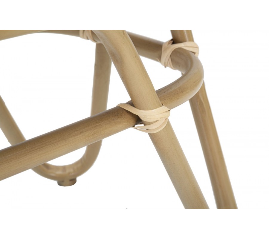 Konštrukcia je vyrobená z kovu v hnedej farbe, ktorá pripomína vzhľad ratanu a vyznačuje sa ohýbanými nožičkami, ktoré sú prepojené spevňujúcimi oblúkmi a kruhovým prvkom v spodnej časti, omotané ratanom, čo dodáva lavici stabilitu a estetický vzhľad.