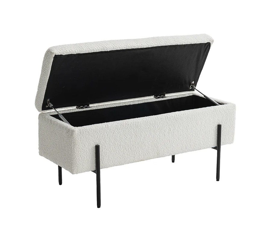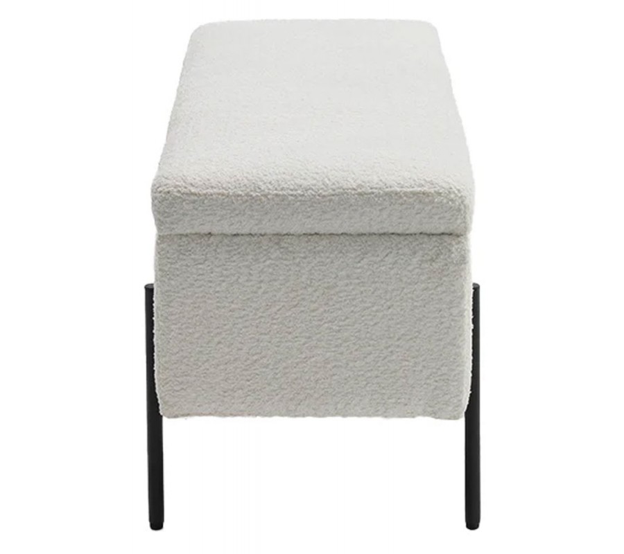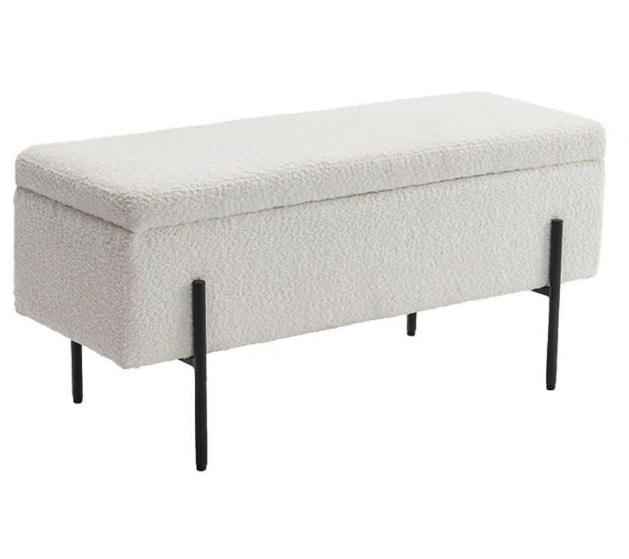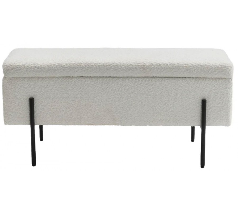 Moderná obdĺžniková lavica s úložným priestorom Irvin s bielym buklé poťahom s čiernymi kovovými nožičkami 100 cm
