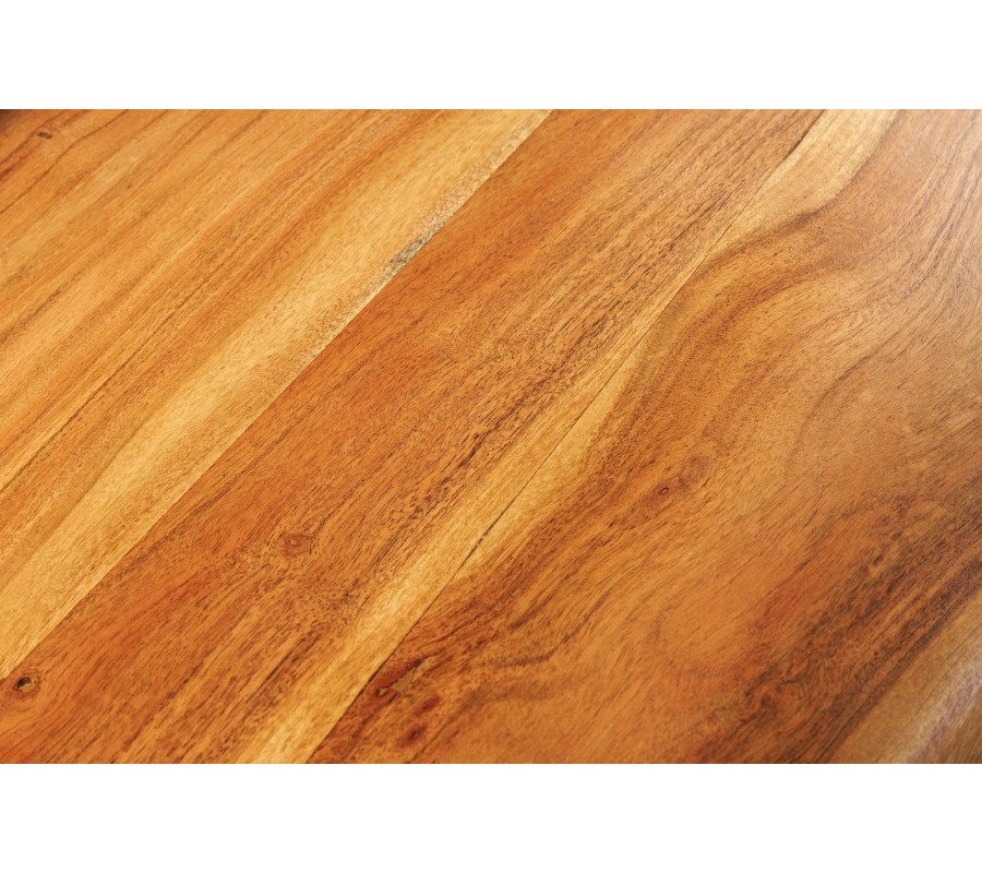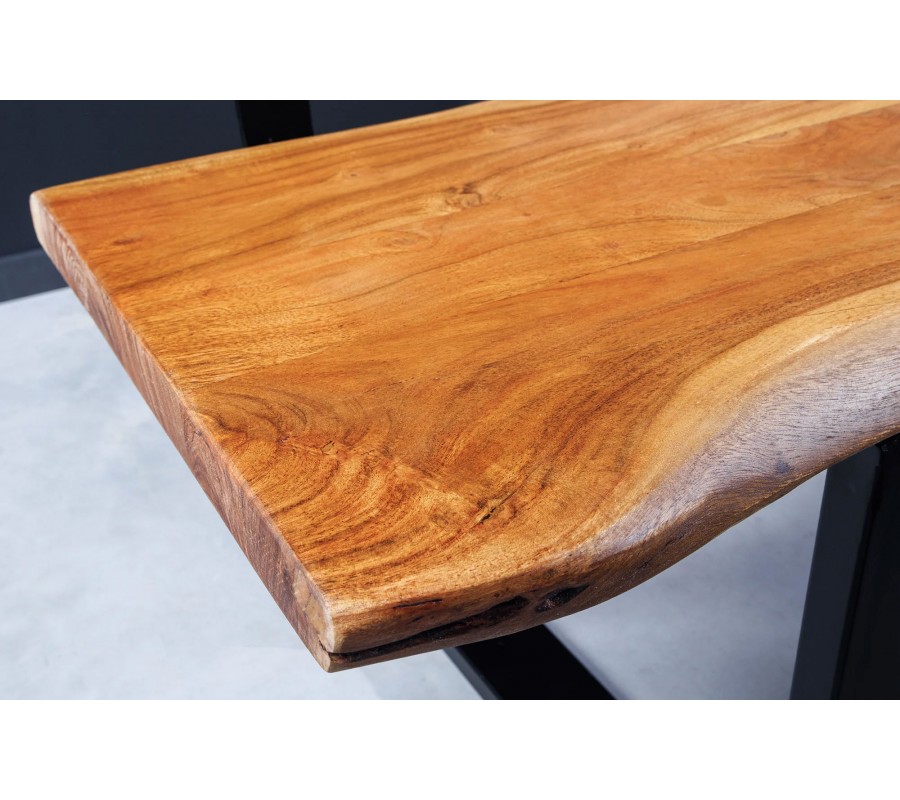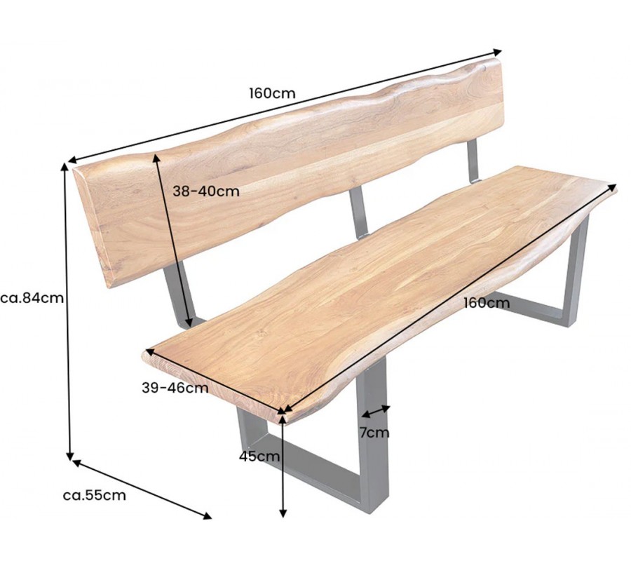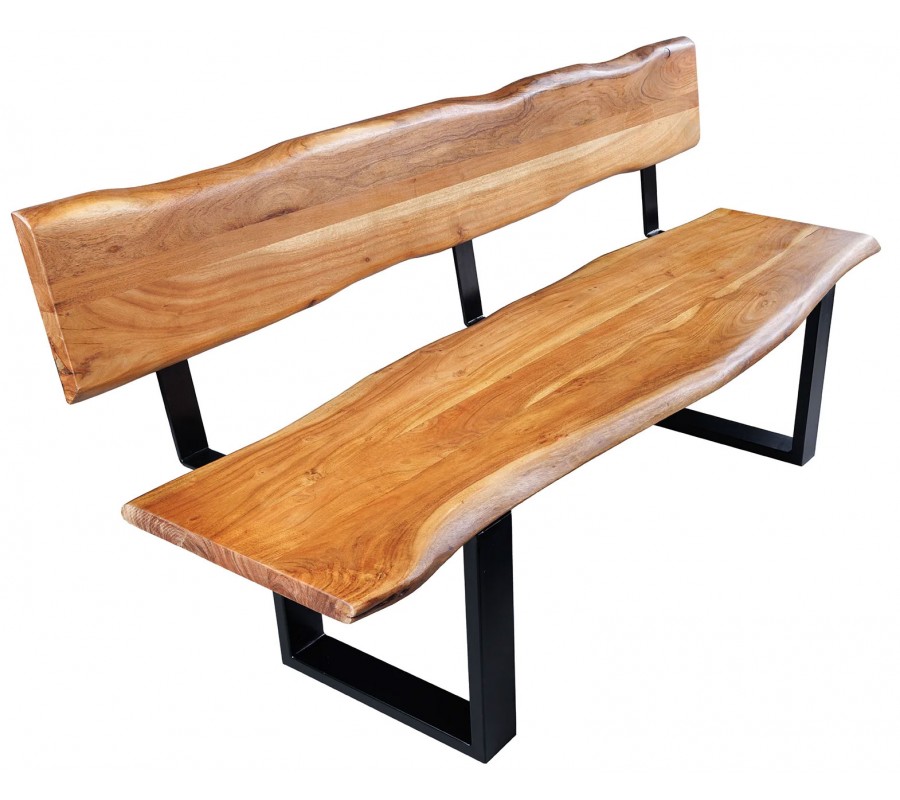 Materiálom je akáciové drevo, ktoré vyniká svojou prirodzenou kresbou a letokruhmi, pričom povrch je lakovaný pre dlhšiu životnosť a medový hnedý odtieň podčiarkuje jeho eleganciu. Podporu lavice zabezpečuje stabilná kovová konštrukcia v čiernej farbe. Nohy majú tvar U a sedacia časť je pripojená k chrbtovej opierke tromi lineárnymi priečkami v rovnakom čiernom kovovom prevedení.