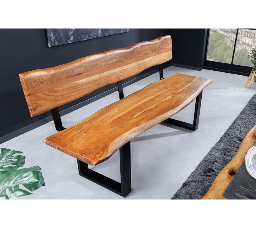 Dizajnová industriálna lavica Bronx s opierkou z masívneho akáciového dreva hnedej farby s čiernym kovovým rámom 100 cm