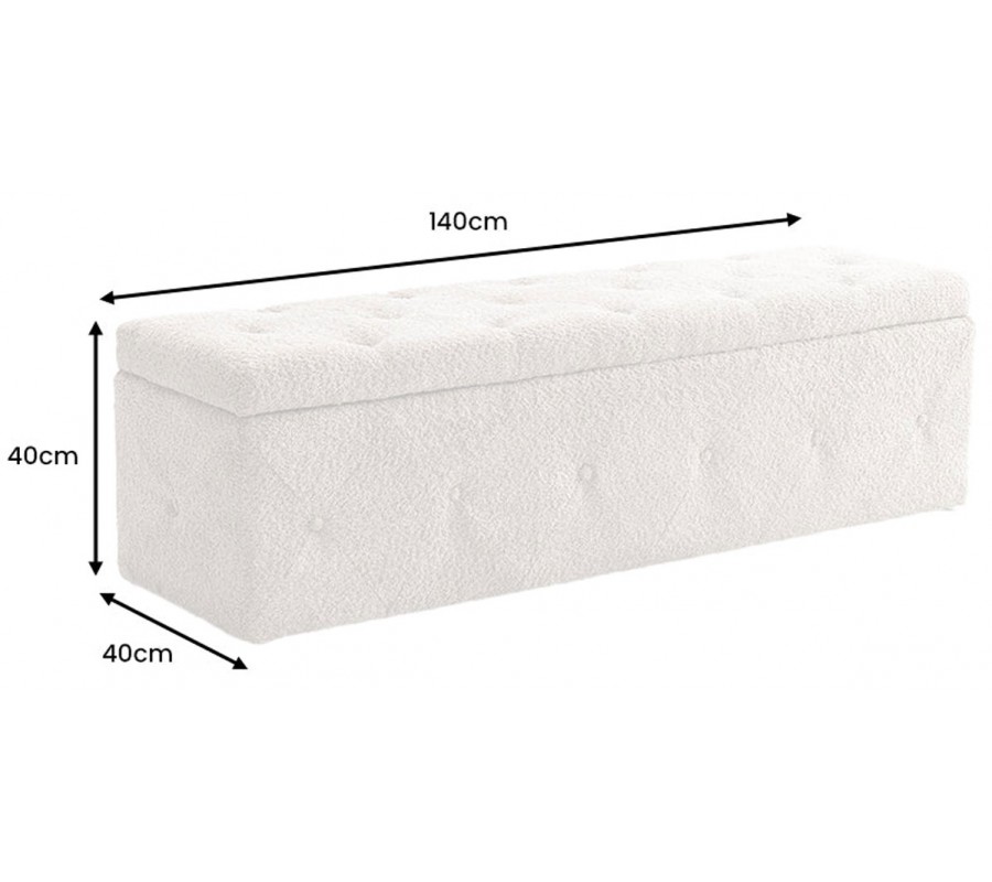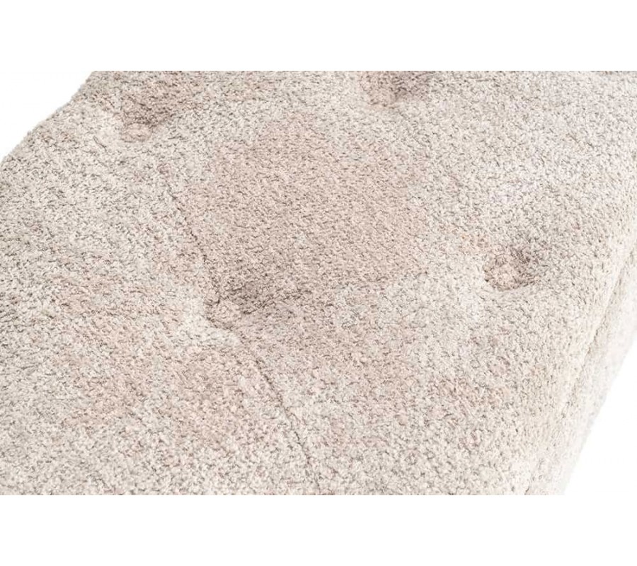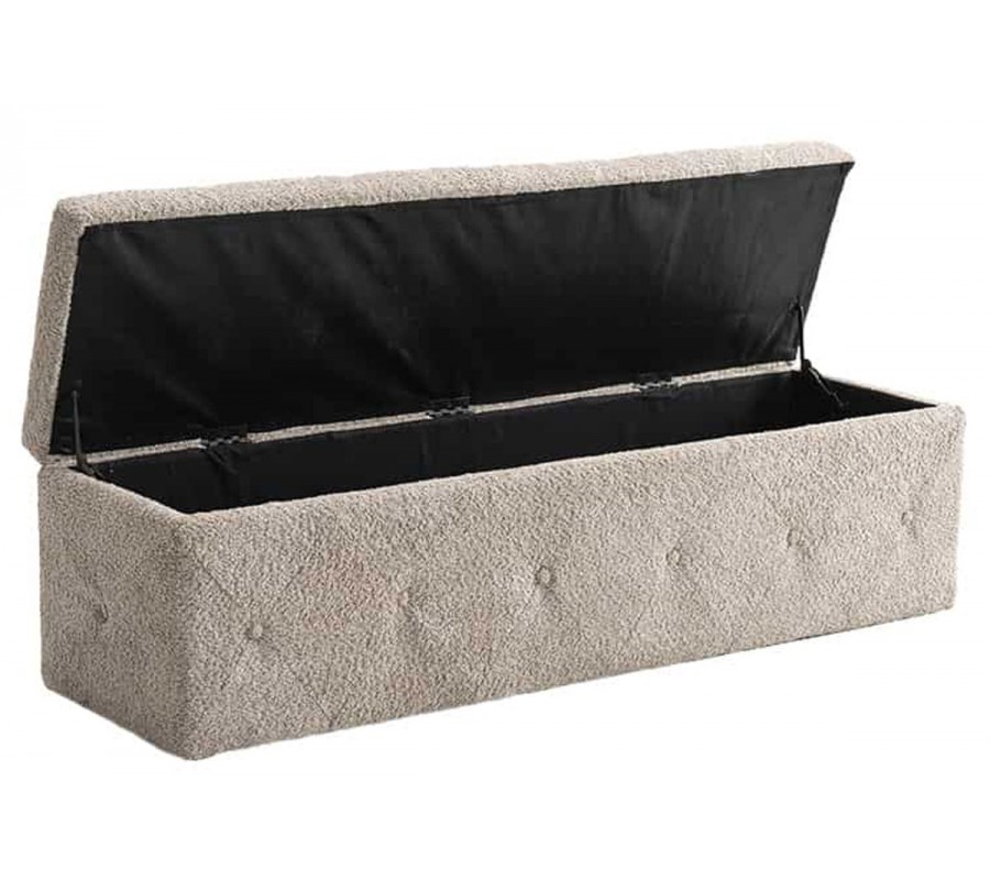 Povrch lavice je potiahnutý látkou bouclé v odtieni greige, ktorý kombinuje tóny béžovej a sivej farby. Bouclé materiál vyniká svojou mäkkou textúrou a nadčasovým vzhľadom. Zdobí ho minimalistické prešívanie s okrúhlymi gombíkmi. Lavica disponuje praktickým úložným priestorom, ktorý je ľahko prístupný vďaka vyklápaciemu sedadlu. Vnútro úložného priestoru je potiahnuté čiernou textíliou, čo vytvára decentný kontrast k svetlému čalúneniu.