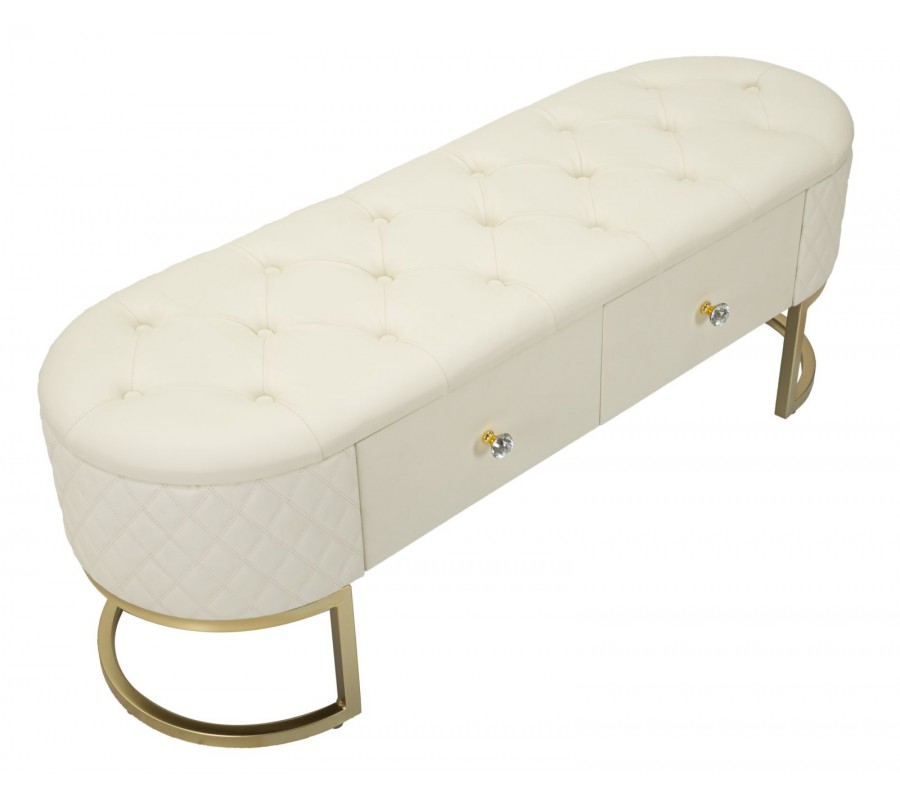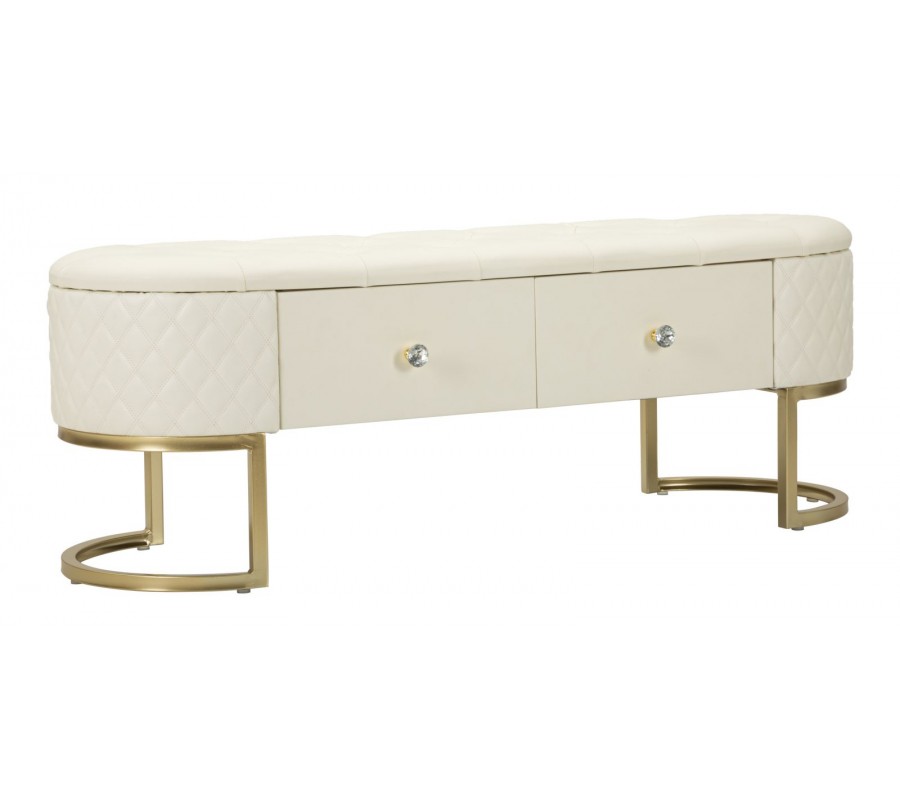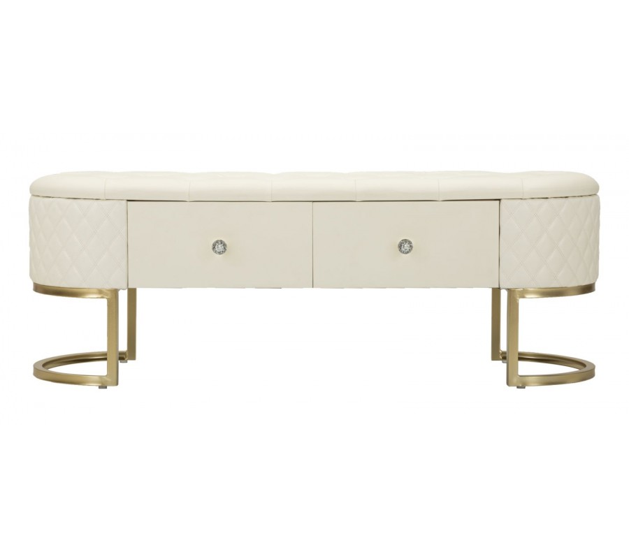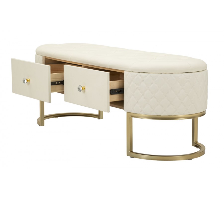 Glamour krémová oválna lavica Glamia Tapisé s koženým poťahom s ozdobným prešívaním s dvomi zásuvkami a zlatou podstavou 120 cm