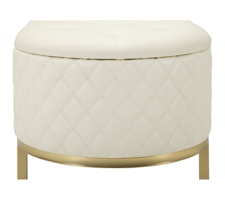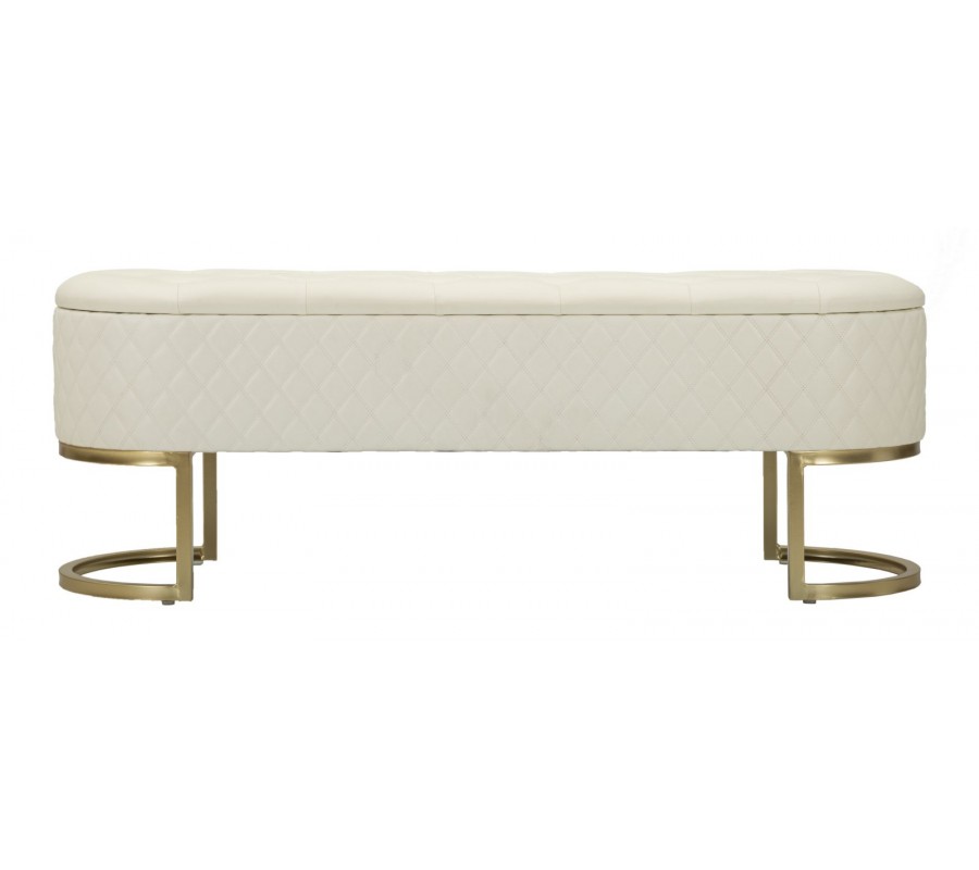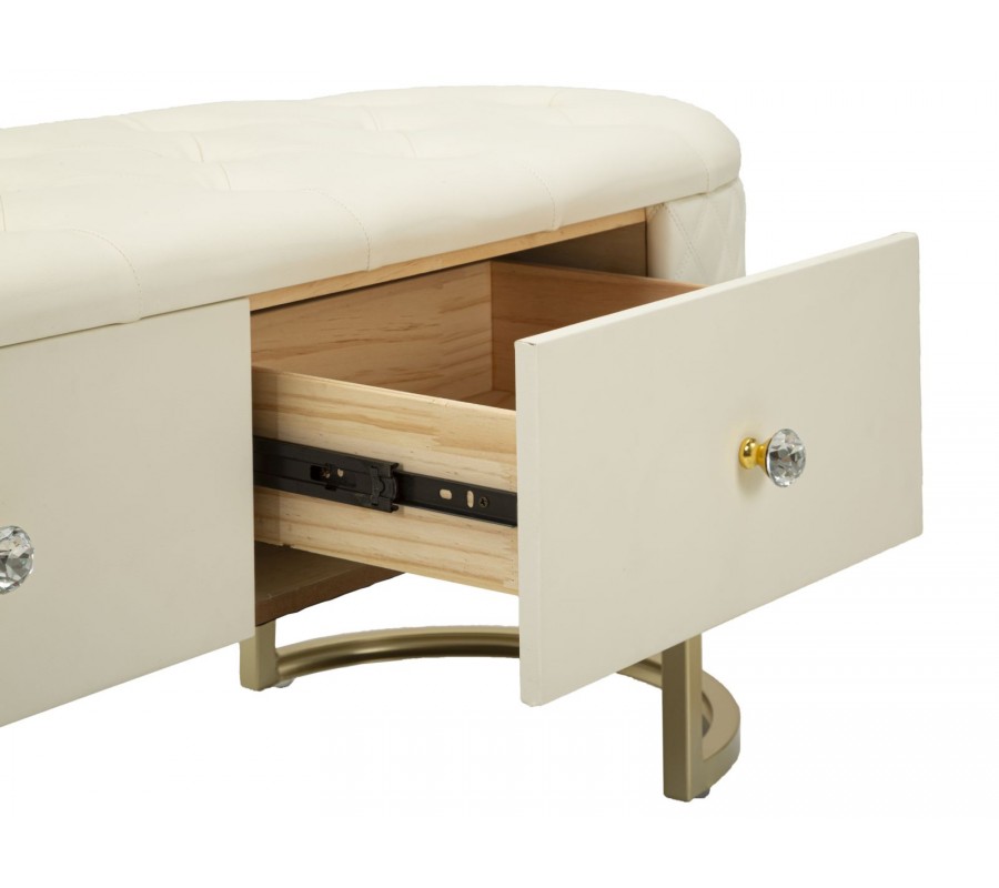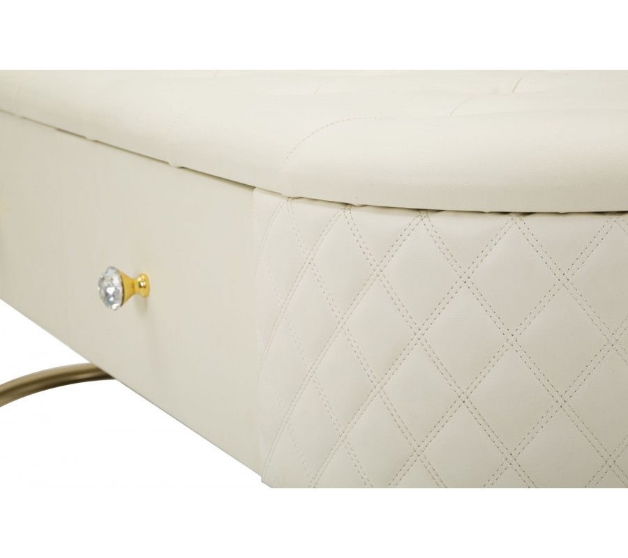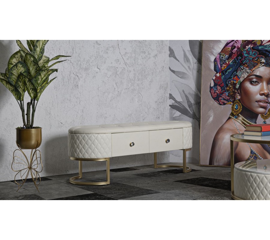 Glamour krémová oválna lavica Glamia Tapisé s koženým poťahom s ozdobným prešívaním s dvomi zásuvkami a zlatou podstavou 120 cm