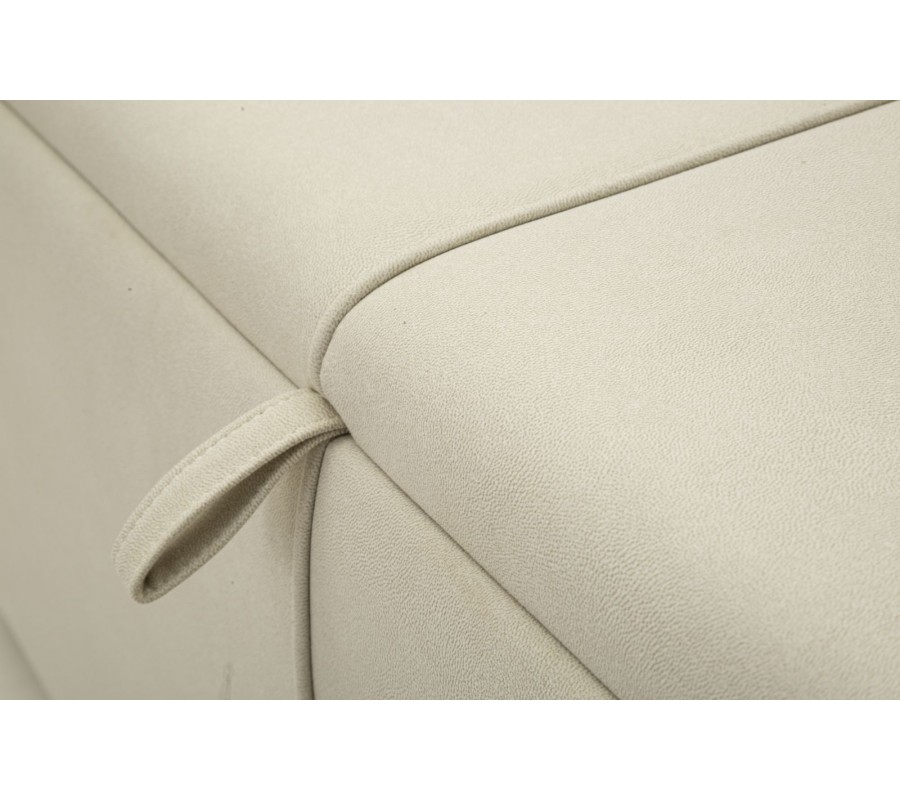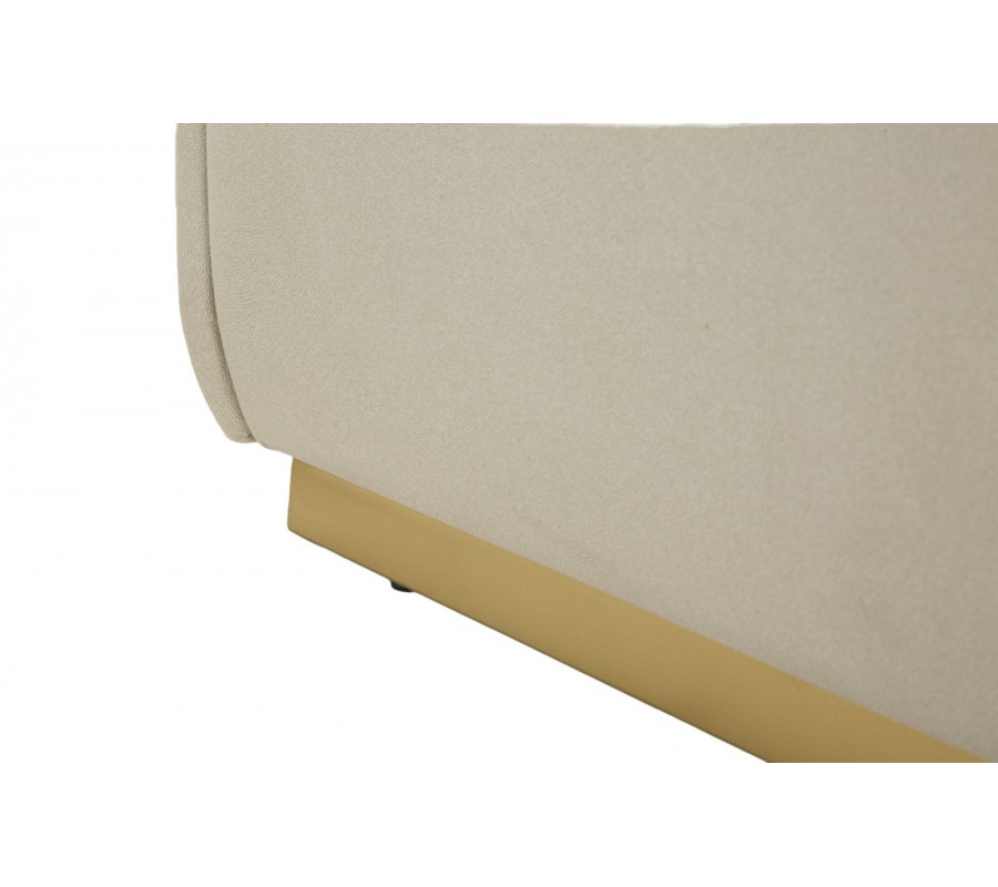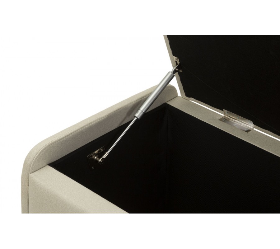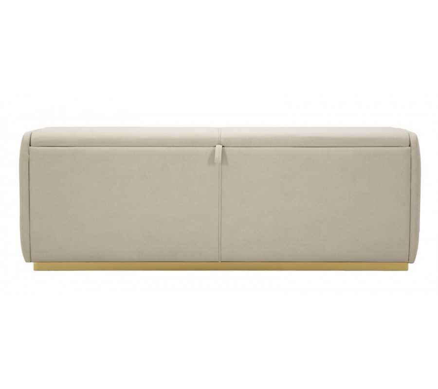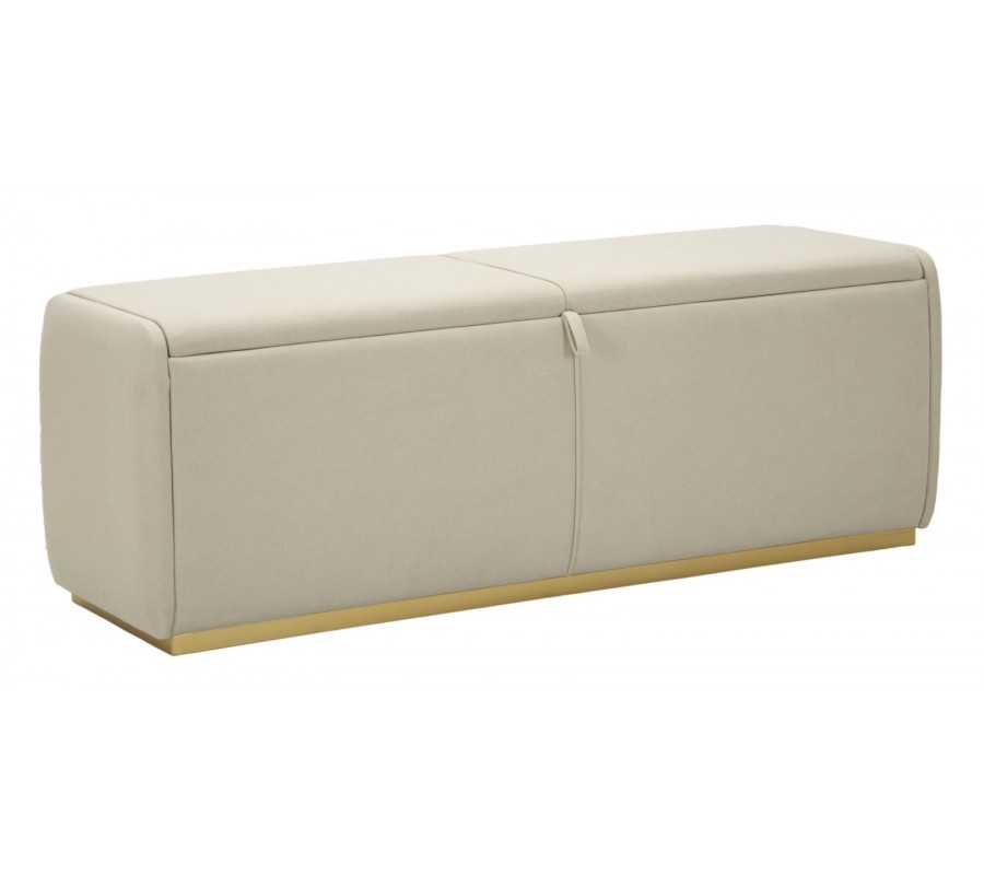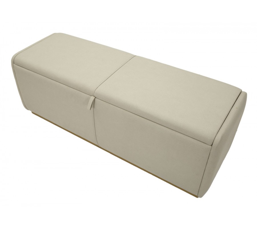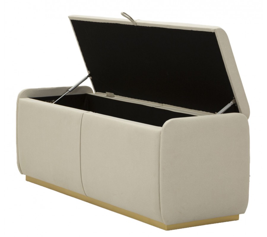 Lavica má obdĺžnikový tvar a jej lineárne hrany zjemňuje penové čalúnenie. Smerom dole sa mierne zužuje ku kovovej podstave v zlatej farbe. Poťah je textilný, v elegantnej svetlej sivej farbe. Stredom prechádza rovná línia prešívania, na ktorej je umiestnená aj látková úchytka. Pomocou nej je možné veko vyklopiť, čím sa sprístupní veľký úložný priestor. Minimalistický dizajn a elegantné farebné prevedenie pôsobí moderným dojmom, zatiaľ čo kovová podstava v zlatej farbe prináša jemný dotyk luxusu.
