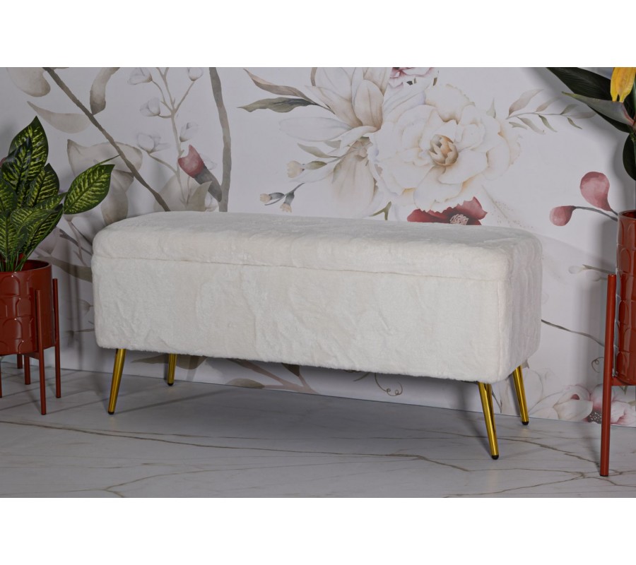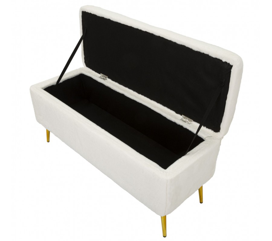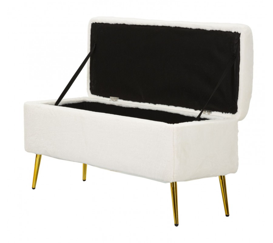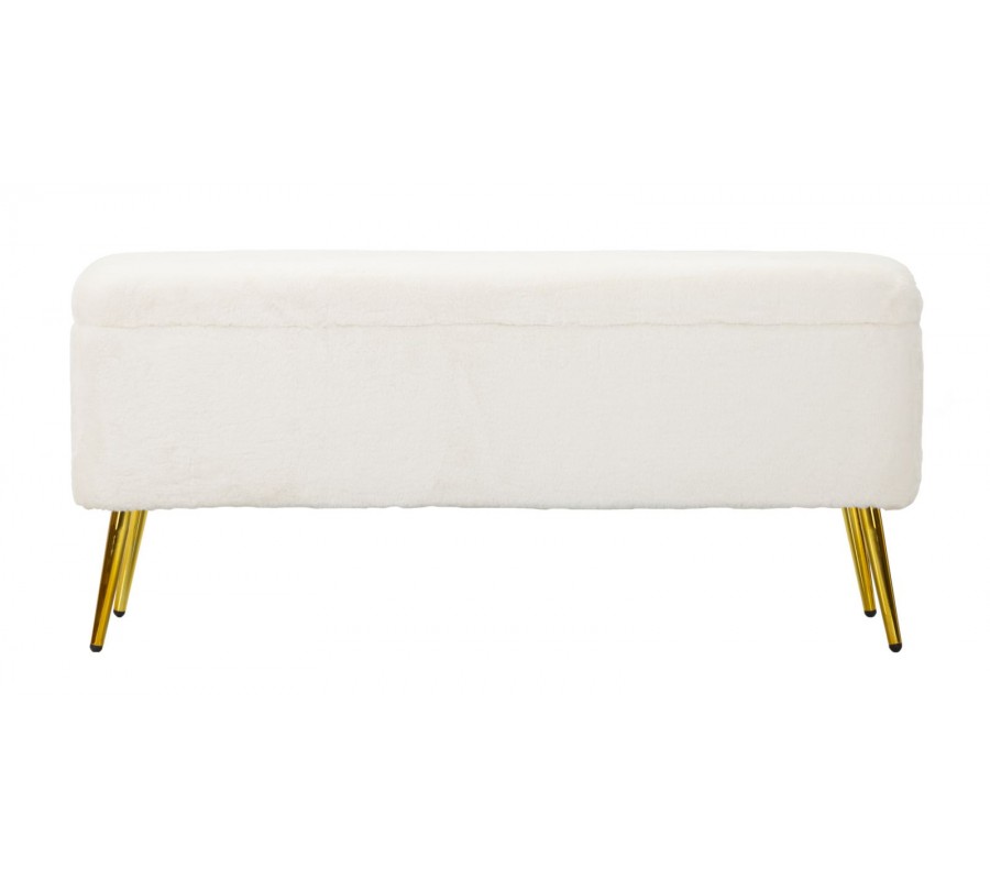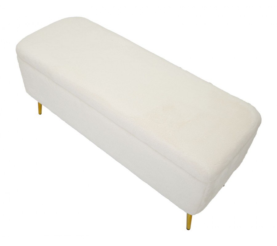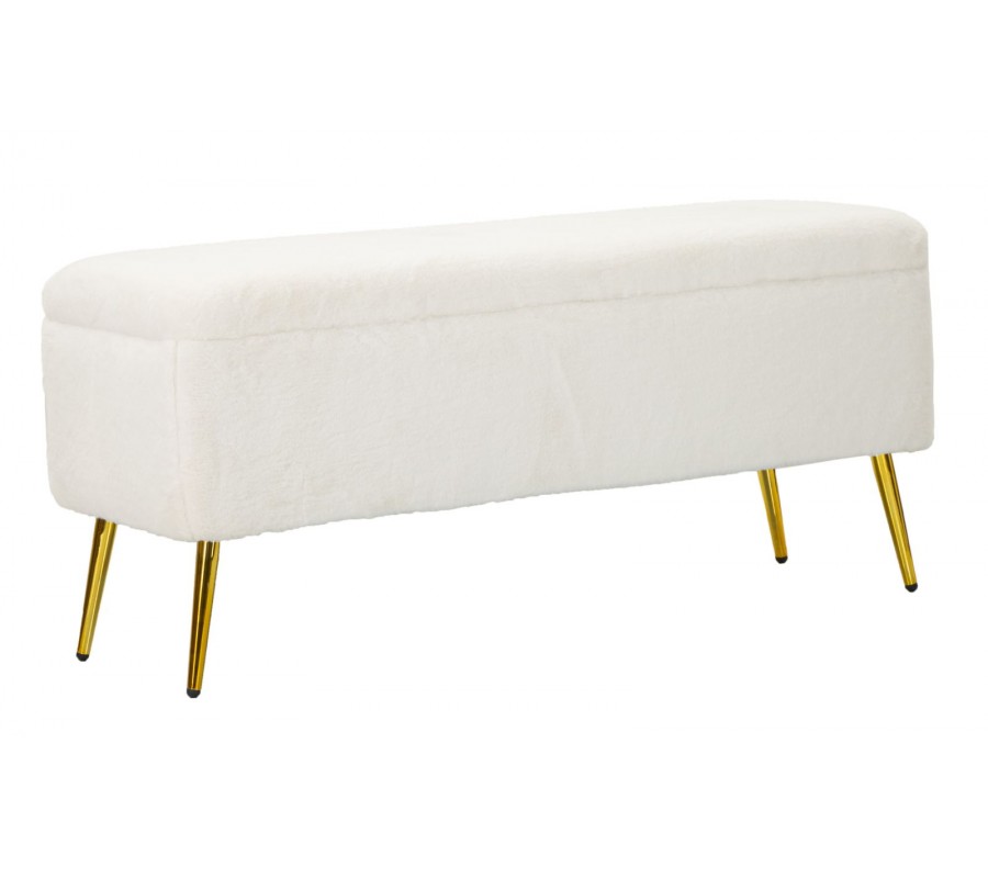 Art deco obdĺžniková kožušinová čalúnená biela lavica Pasil s úložným priestorom a zlatými kovovými nožičkami 112 cm
