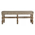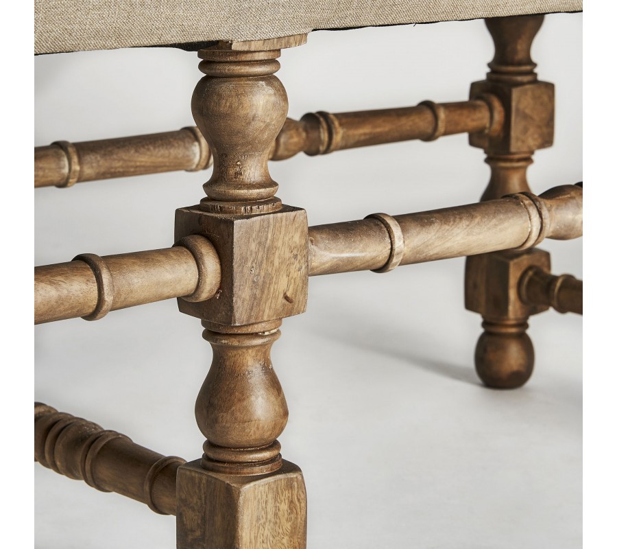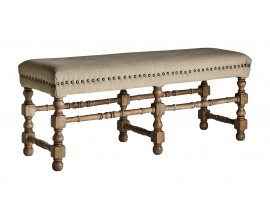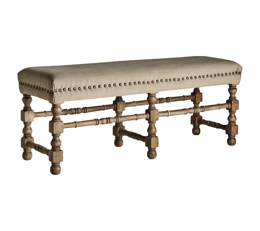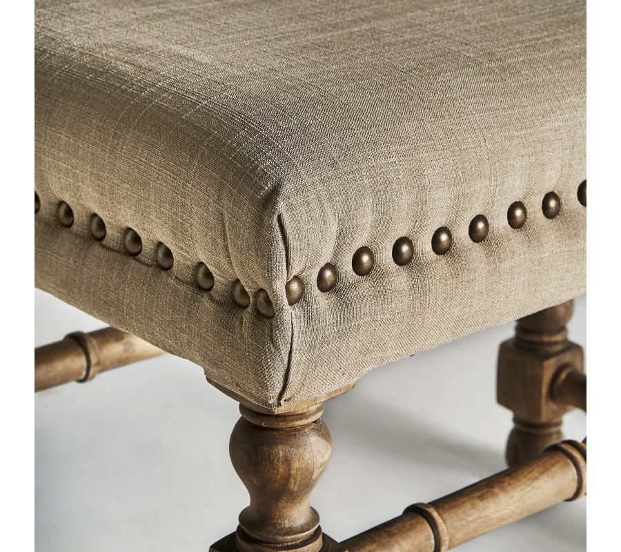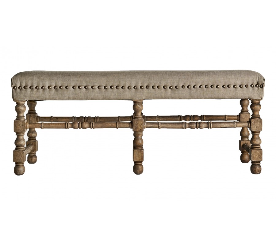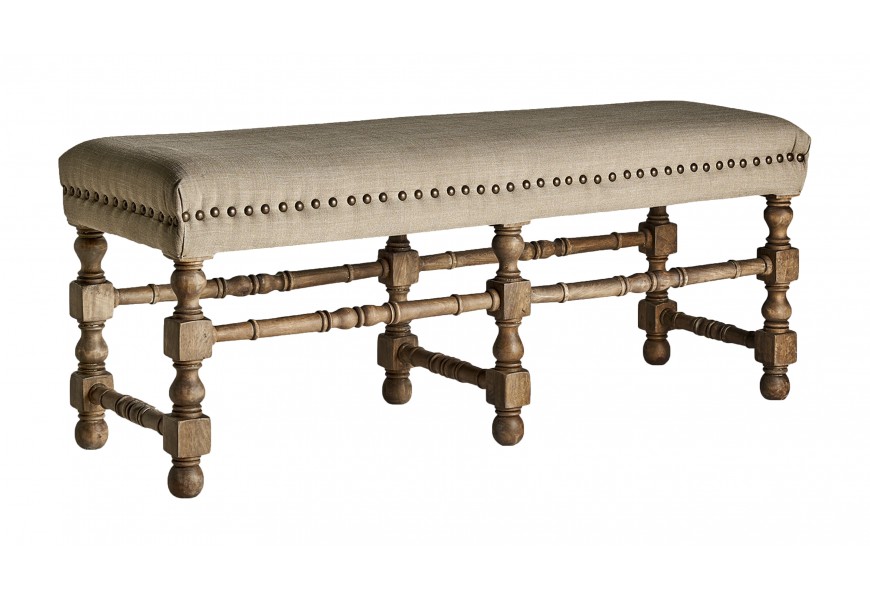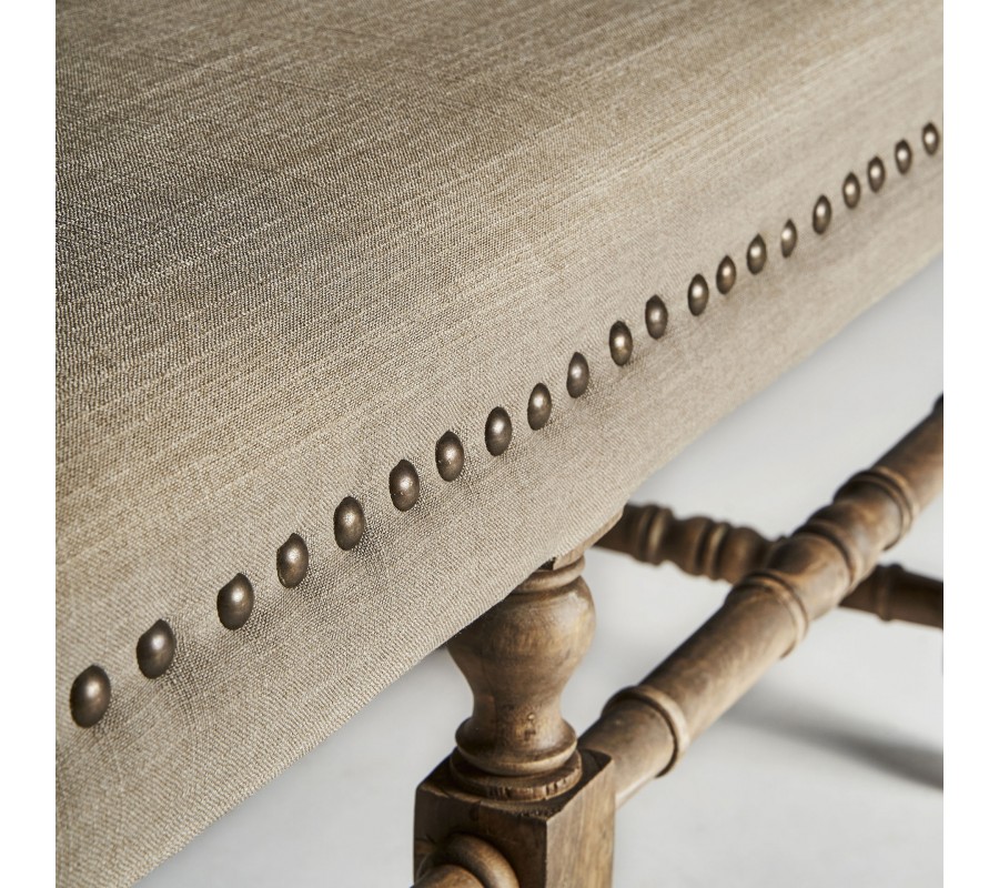 Horná čalúnená časť je v obdĺžnikovom tvare, potiahnutá sivým ľanovým textilom a po obvode ozdobená pravidelnou líniou kovových nitov, ktoré lavici dodávajú jemný vintage akcent. Vďaka svojmu vzhľadu sa hodí do vidieckych, koloniálnych aj klasických interiérov, ako lavica do chodby, k posteli do spálne alebo k stene v jedálni. Výborne ladí s nábytkom z mangového alebo dubového dreva, ľanovými textíliami, ratanovými výpletmi a kovovými doplnkami v starozlatej alebo čiernej farbe.