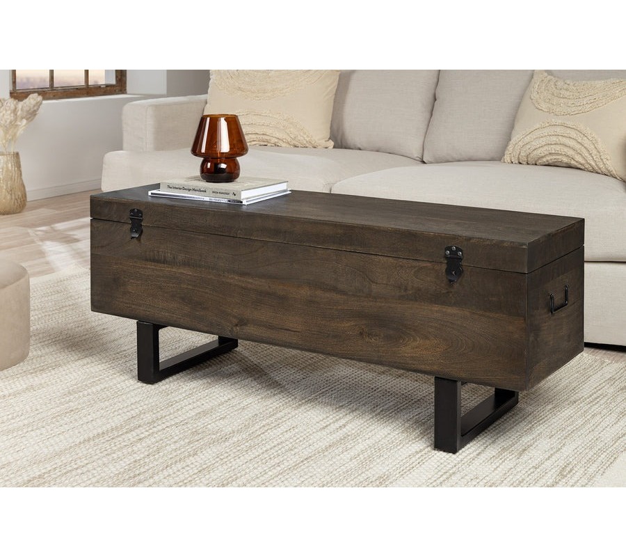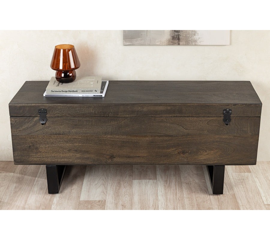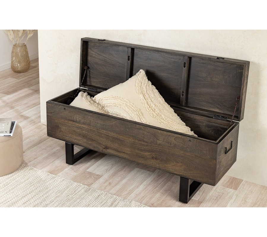 Industriálna truhlica Clermont zaujme svojim robustným a nadčasovým dizajnom. Je vyrobená z masívneho mangového dreva v tmavohnedom odtieni s viditeľnou, jemnou štruktúrou letokruhov, ktoré dodávajú nábytku prirodzený a autentický vzhľad. Priestranný úložný priestor sa ukrýva pod masívnym poklopom, ktorý je z vnútornej strany istený krátkymi kovovými retiazkami, čím sa zabraňuje jeho úplnému preklopeniu dozadu.