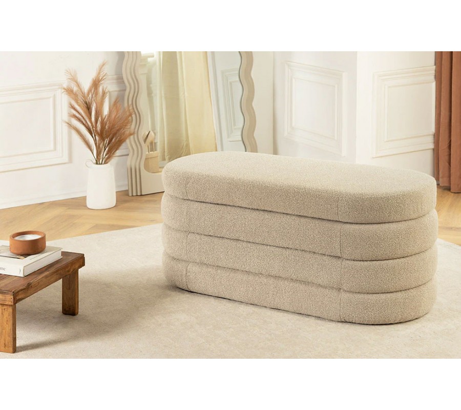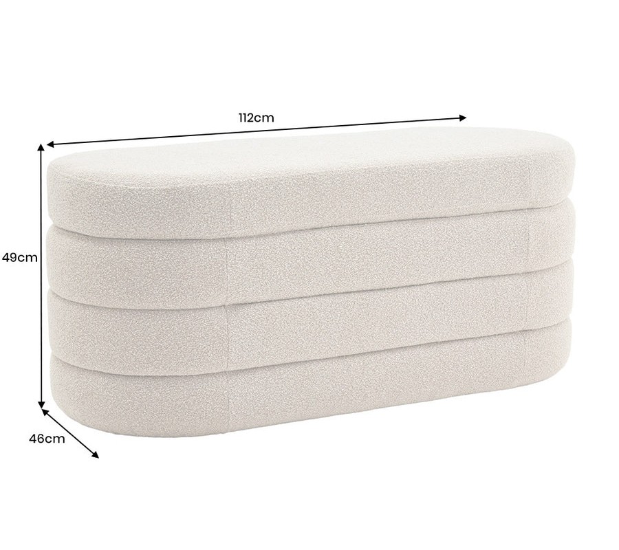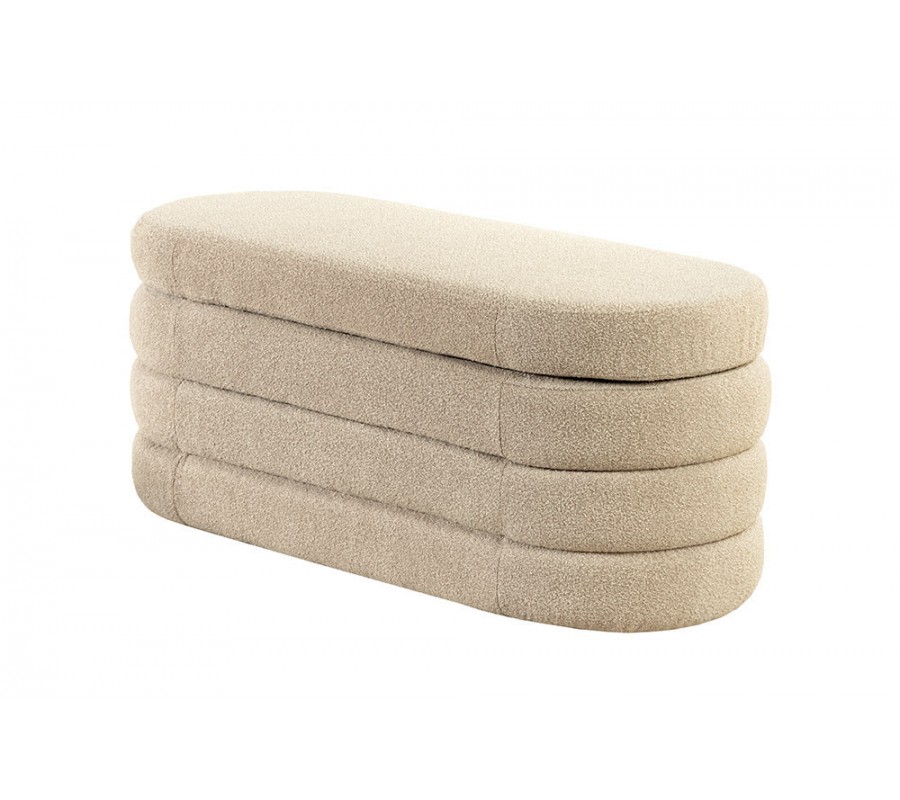 Moderná oválna lavica Eliana s vrstveným dizajnom a úložným priestorom s béžovým bouclé poťahom 112 cm