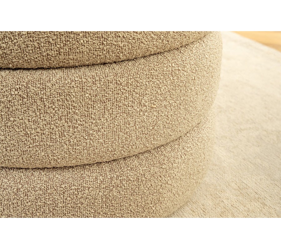 Lavica Eliana vyniká nezvyčajným vrstveným dizajnom, ktorý vytvára dojem štyroch nad sebou uložených čalúnených segmentov. Jej oválny tvar s jemne zaoblenými hranami pôsobí mäkko a moderne zároveň. Celý povrch lavice pokrýva kvalitná bouclé látka v taupé béžovom odtieni, ktorá je na dotyk hebká a vizuálne útulná.