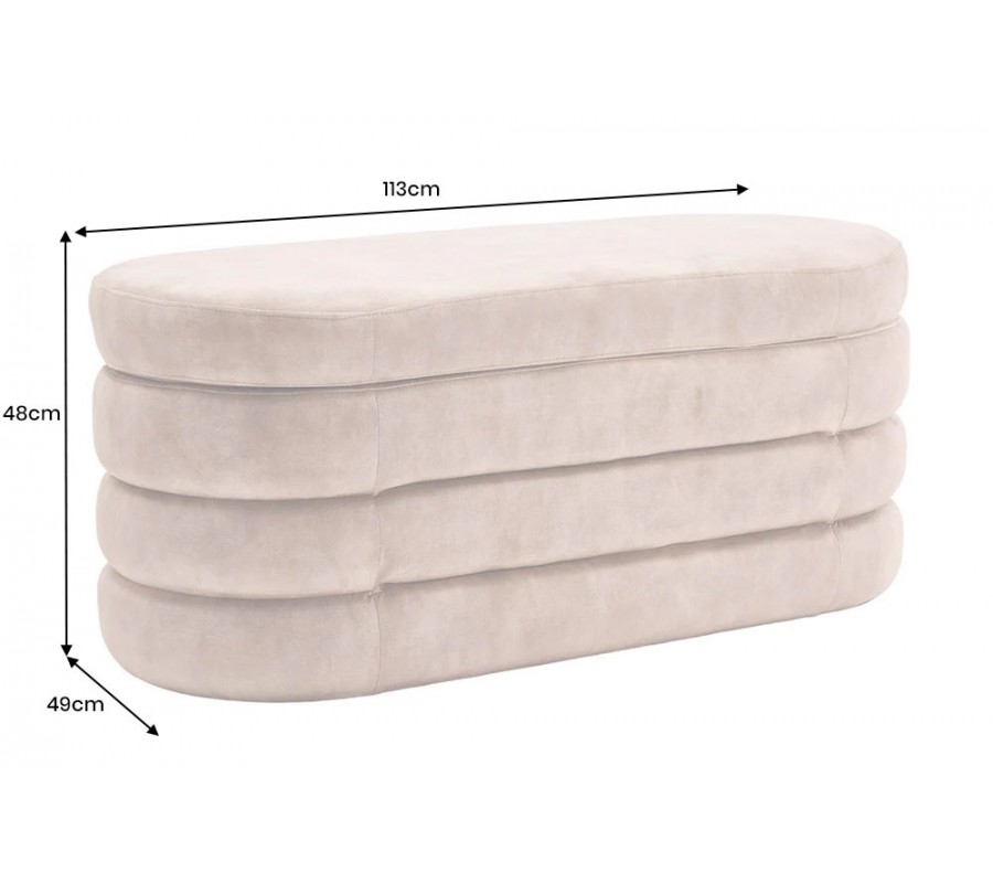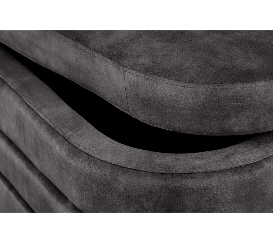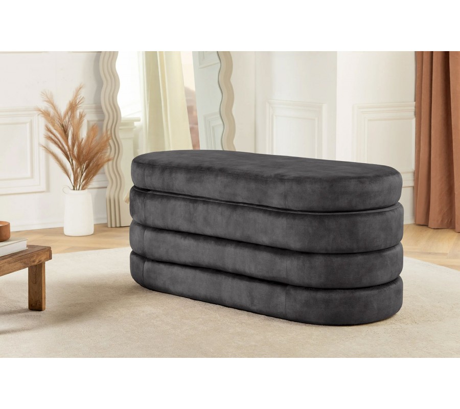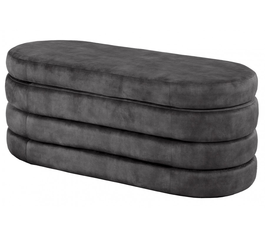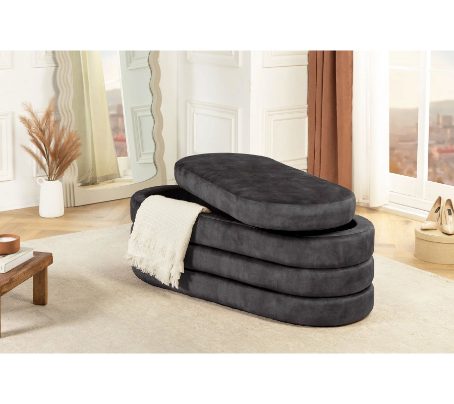 Moderná oválna sivá lavica Eliana s vrstveným dizajnom a úložným priestorom v čiernej zamatovej látke 113 cm