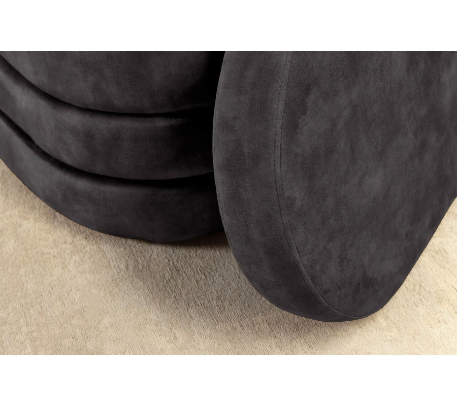 Dvojmiestna lavica Eliana predstavuje štýlové a praktické riešenie do moderného interiéru. Jej oválny tvar a výrazný dizajn vrstvenia, ktorý pripomína štyri čalúnené vrstvy položené na seba, vytvára výnimočný vizuálny dojem. Povrch pokrýva zamatová látka v elegantnej čiernej farbe, ktorá dodáva lavici sofistikovaný a luxusný charakter.