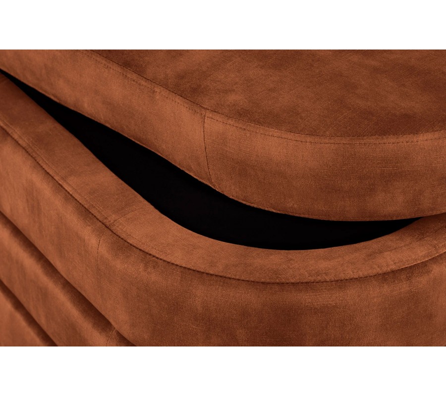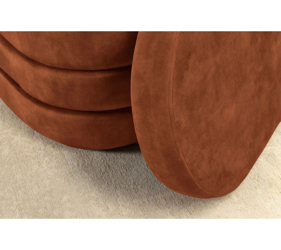 Lavica Eliana má jemne zaoblený oválny tvar, ktorý pôsobí harmonicky a moderne zároveň. Povrch tvorí zamatový materiál v sýtom hnedom odtieni, pričom celý objem je vizuálne rozčlenený do štyroch zaoblených vrstiev. Takéto prevedenie vytvára dojem plastickej, mäkkej a zároveň originálnej konštrukcie. Nejde o poťah, ale o pevné čalúnenie s výplňou, ktoré zabezpečuje pohodlné sedenie pre dve osoby.