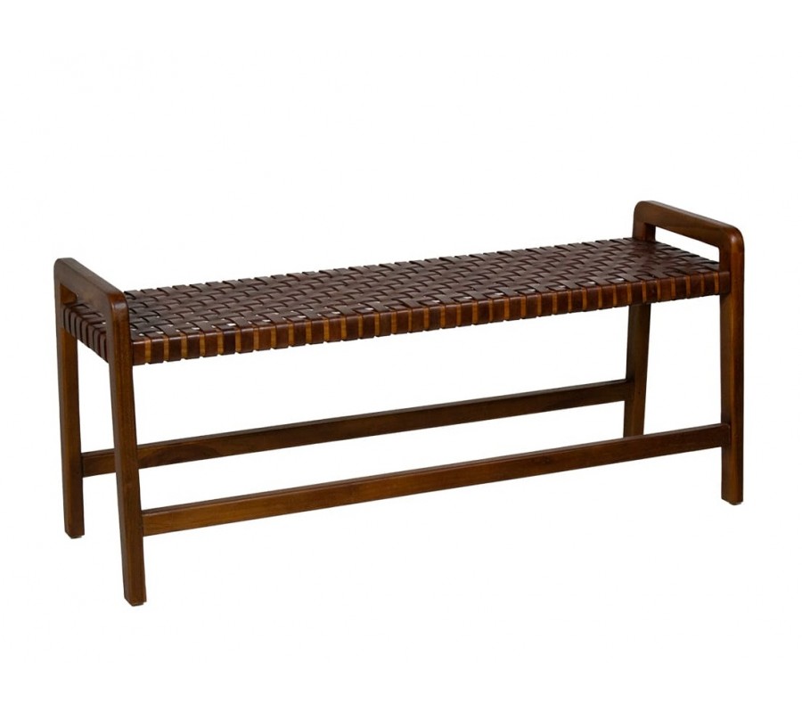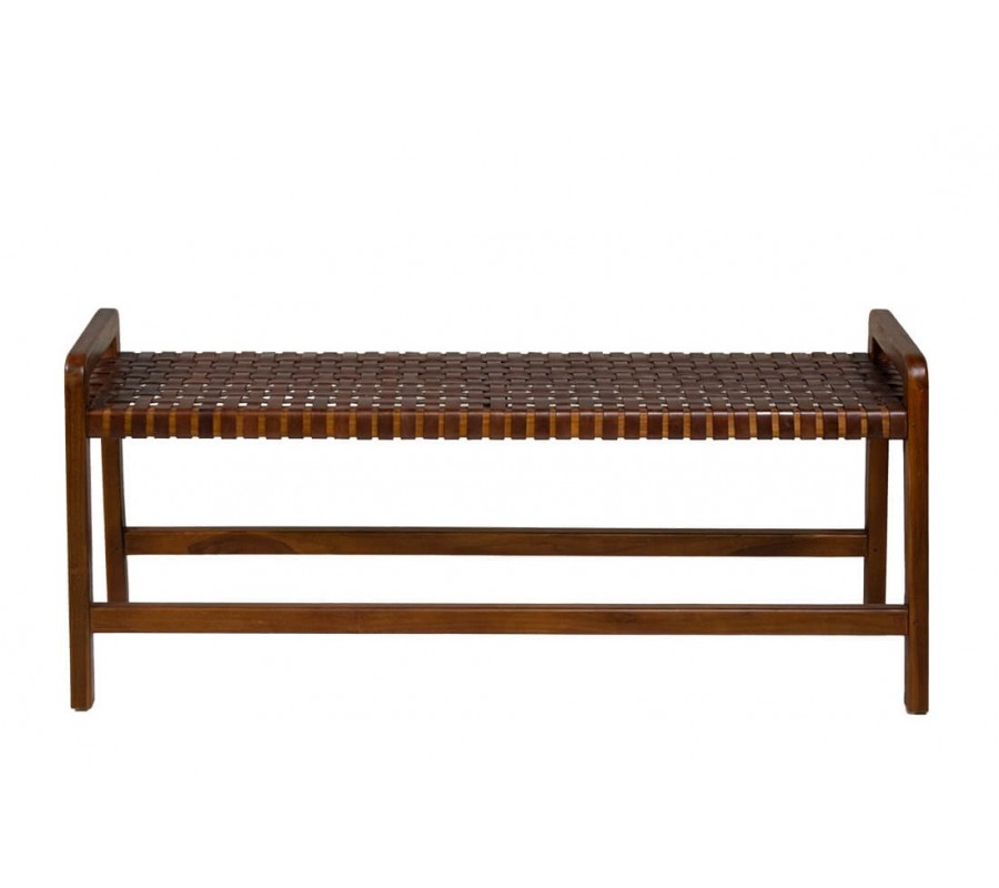 Koloniálna kožená dvojmiestna obdĺžniková lavica Timal z masívneho teakového dreva s výpletom v tmavohnedej farbe 120 cm