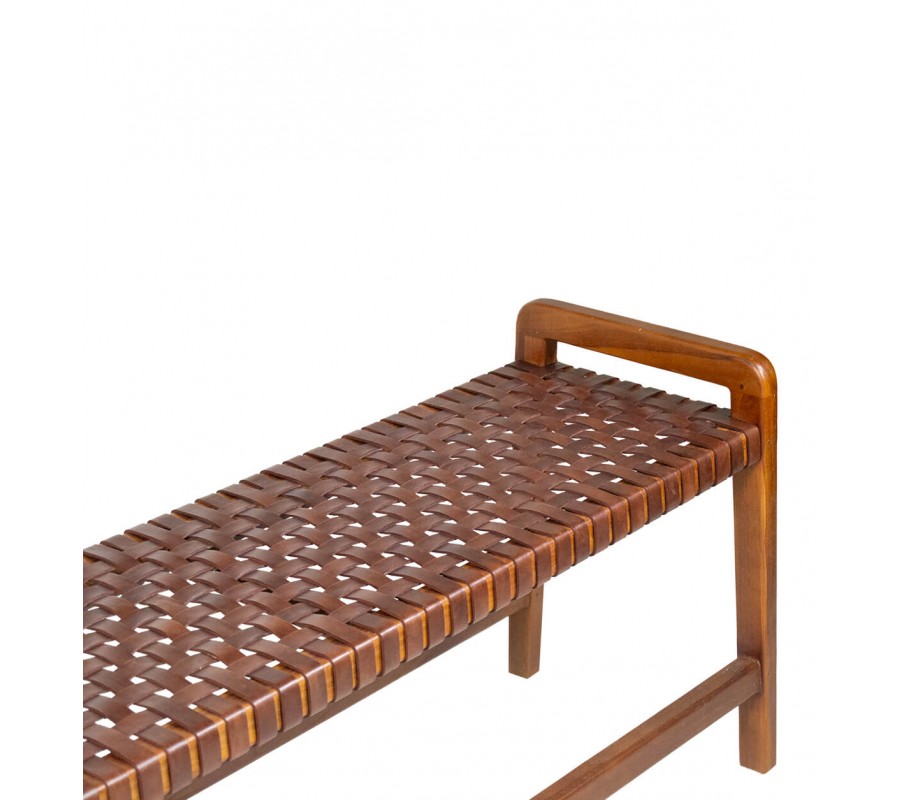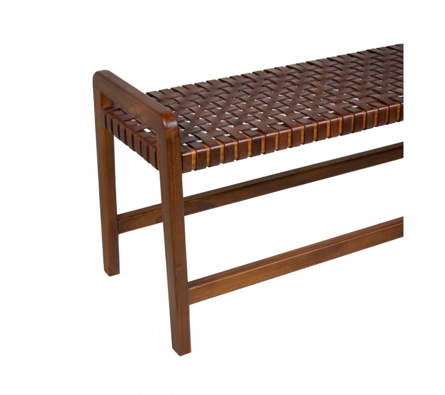 Vrchná časť lavice je doplnená o výrazný štvorčekový výplet, ktorý jej dodáva remeselný charakter. Lakovaný povrch zvýrazňuje štruktúru teakového dreva a chráni ho pred opotrebením. Pod sedacou časťou sa nachádzajú dve horizontálne spojovacie tyče, ktoré dodávajú pevnosť celej konštrukcii.