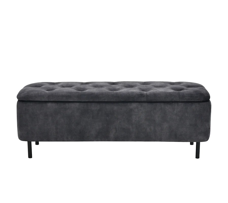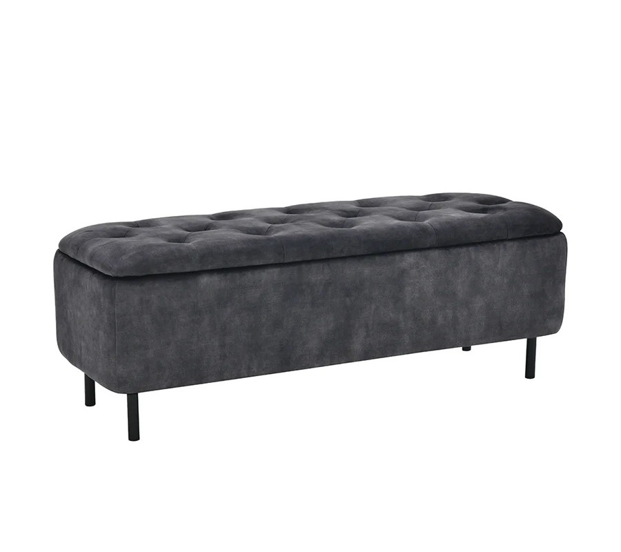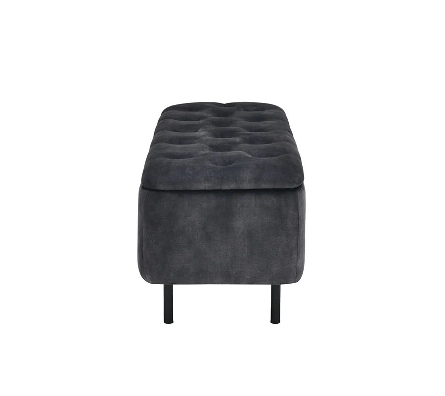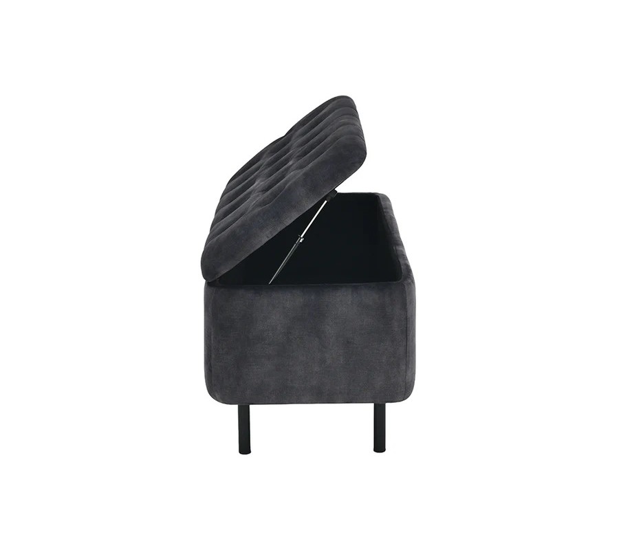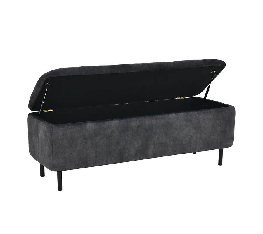 Sedadlo je upevnené dvojicou pántov a je ho možné nadvihnúť, čím sa sprístupní štedrý úložný priestor, ideálny na uskladnenie sezónnych textílií či obuvi. Vnútro je potiahnuté čiernou látkou a vonkajšie strany sú sivé zamatové, bez prešívania.