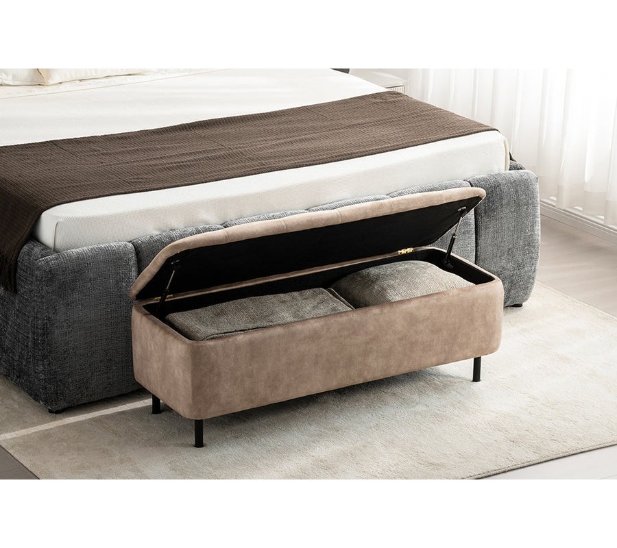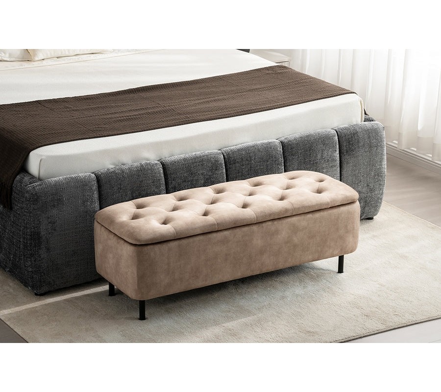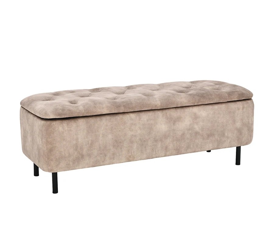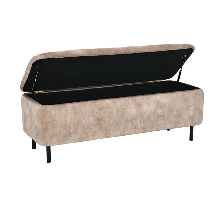 Lavica Eliana spája moderný dizajn s elegantným béžovým zamatovým prevedením. Vynikne ako estetický doplnok predsiene, spálne či obývačky a oceníte aj praktický úložný priestor.