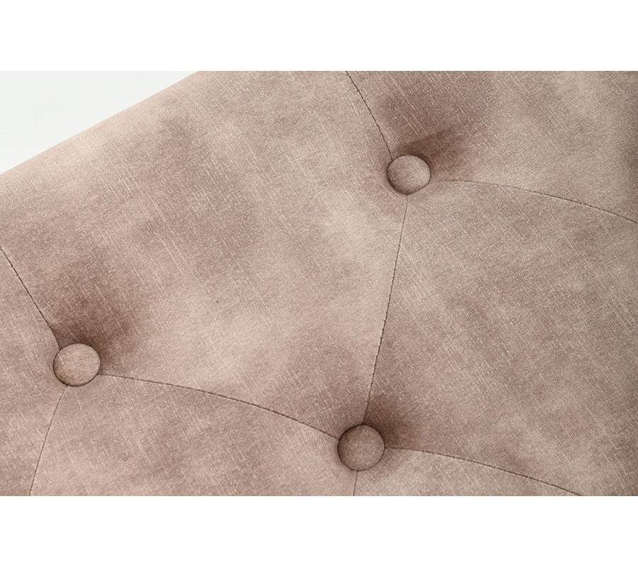 Vrchná časť je čalúnená a pokrytá zamatovým poťahom v béžovom odtieni šampanského. Je príjemný na dotyk a zároveň mu mikrovlákno poskytuje výbornú odolnosť a nenáročnú údržbu. Nožičky z kovu v matnom čiernom prevedení dodávajú dizajnu moderný rozmer a zároveň pôsobia subtílnym dojmom. Sedadlo zdobí prešívanie s okrúhlymi gombíkmi, pripomínajúce luxusný chesterfield štýl.