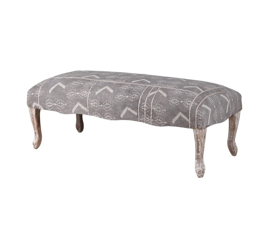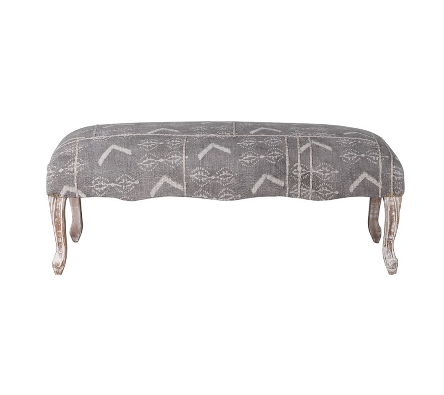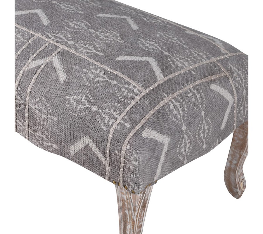 Vintage lavica Amaya spája tradičný remeselný štýl s jemnými dekoratívnymi detailmi. Má obdĺžnikový tvar a čalúnené sedadlo s bavlneným poťahom v sivej farbe s bielymi vzormi, ktoré pripomínajú etno textílie. Vzor pôsobí elegantne a dodáva lavici originálny, autentický vzhľad.