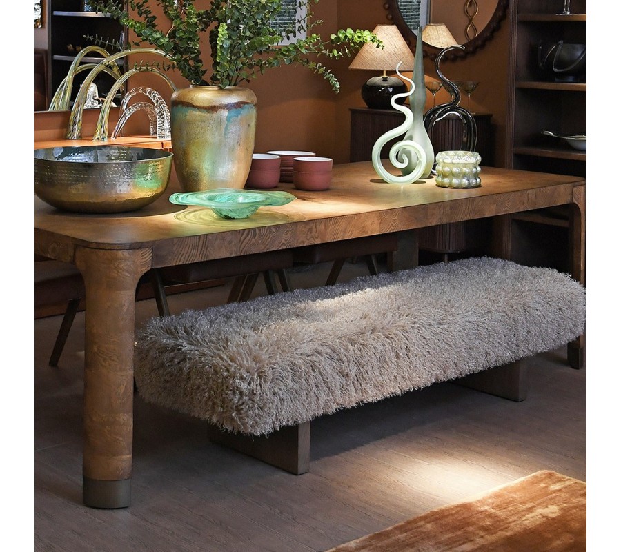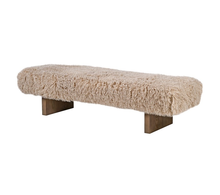 Sedadlo podopierajú dve ploché drevené nohy v hnedom odtieni s výraznou kresbou dreva, ktoré lavici dodávajú stabilitu a zároveň prirodzený kontrast k nadýchanej kožušinovej ploche.