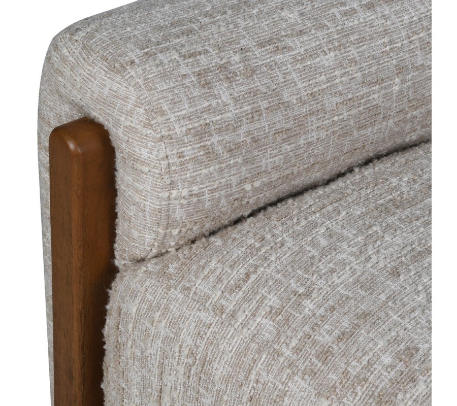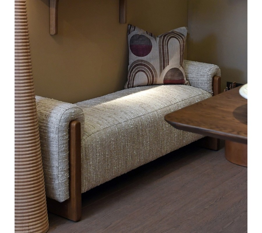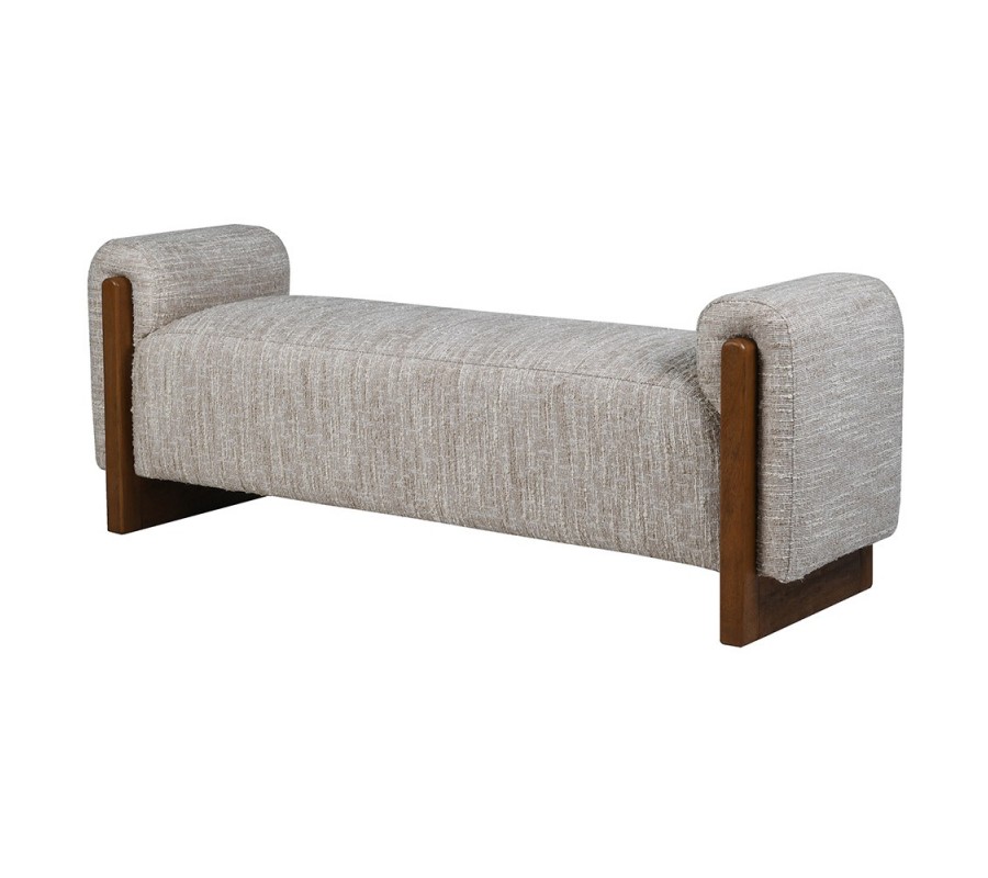 Drevené bočné panely majú vo vrchnej časti zaoblené hrany, ktoré tvarovo korešpondujú s celkovou zaoblenou siluetou lavice. Ich bohatá naturálna hnedá farba vytvorí pocit tepla. Poťah je vyrobený z mikrovlákna, ktoré mu zaručuje výbornú odolnosť a pevnosť. Má výraznú štruktúru, ktorá kombinuje hladké tkanie s výraznejšími uzlíkmi, pripomínajúcimi buklé. Farebné prevedenie v svetlých melírovaných béžových tónoch pôsobí elegantným dojmom.