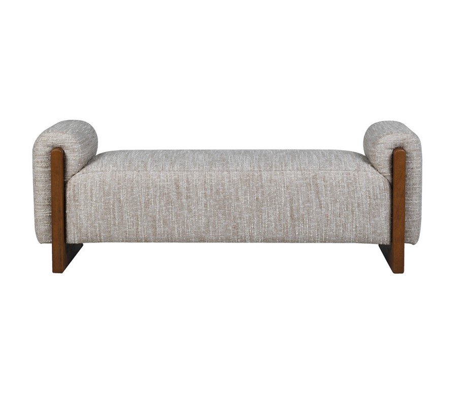 Luxusná retro lavica Adnan s bočnými opierkami s hnedou drevenou konštrukciou a béžovým melírovaným poťahom 150 cm