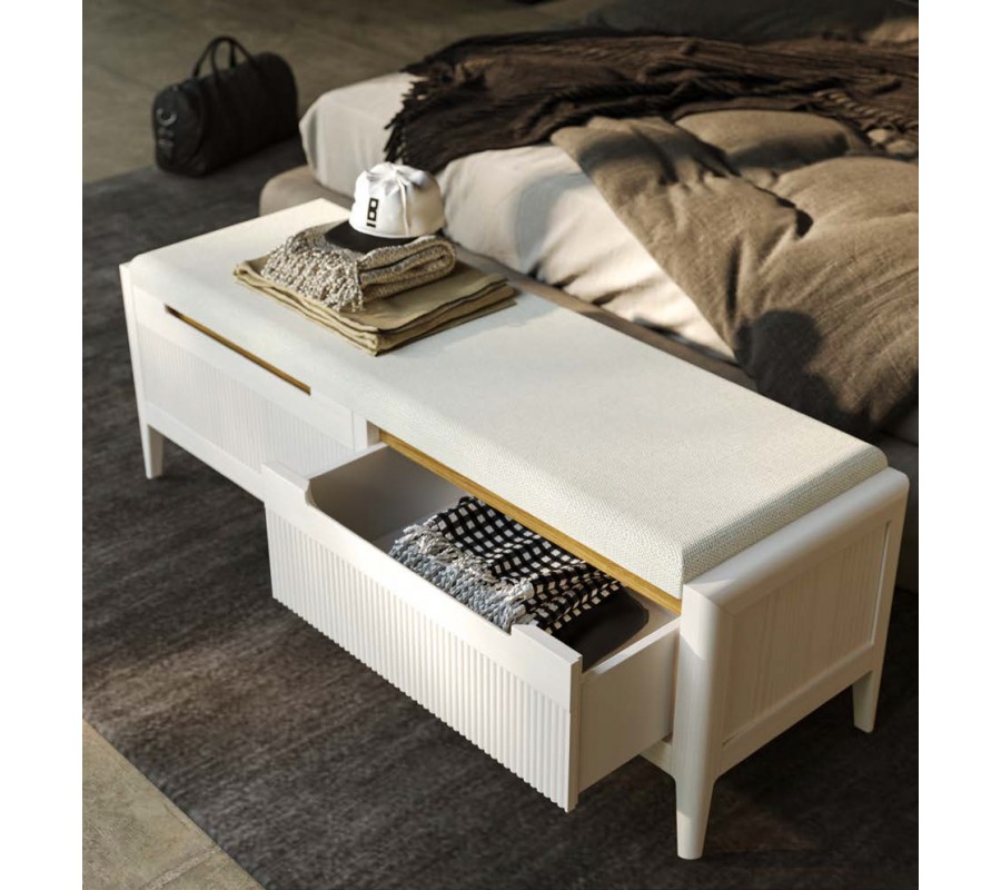Lavica Tallin predstavuje luxusný, štýlový a praktický doplnok do interiéru, ktorý spája vysoký komfort s funkčným úložným priestorom. Obdĺžnikový korpus z masívneho dreva je osadený dvomi zásuvkami s výrazným vertikálnym vrúbkovaním, ktoré pôsobí dekoratívne a zároveň podčiarkuje moderný a exkluzívny charakter kolekcie. Úchytky sú riešené formou jemných výrezov priamo v predných plochách zásuviek, čo vytvára čistý, kompaktný a vizuálne nerušený vzhľad.