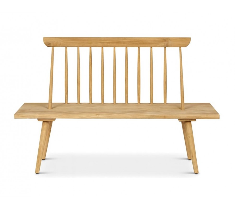 Moderná masívna lavica Hiberto s dizajnovou opierkou z teakového dreva v svetlej hnedej farbe 150 cm