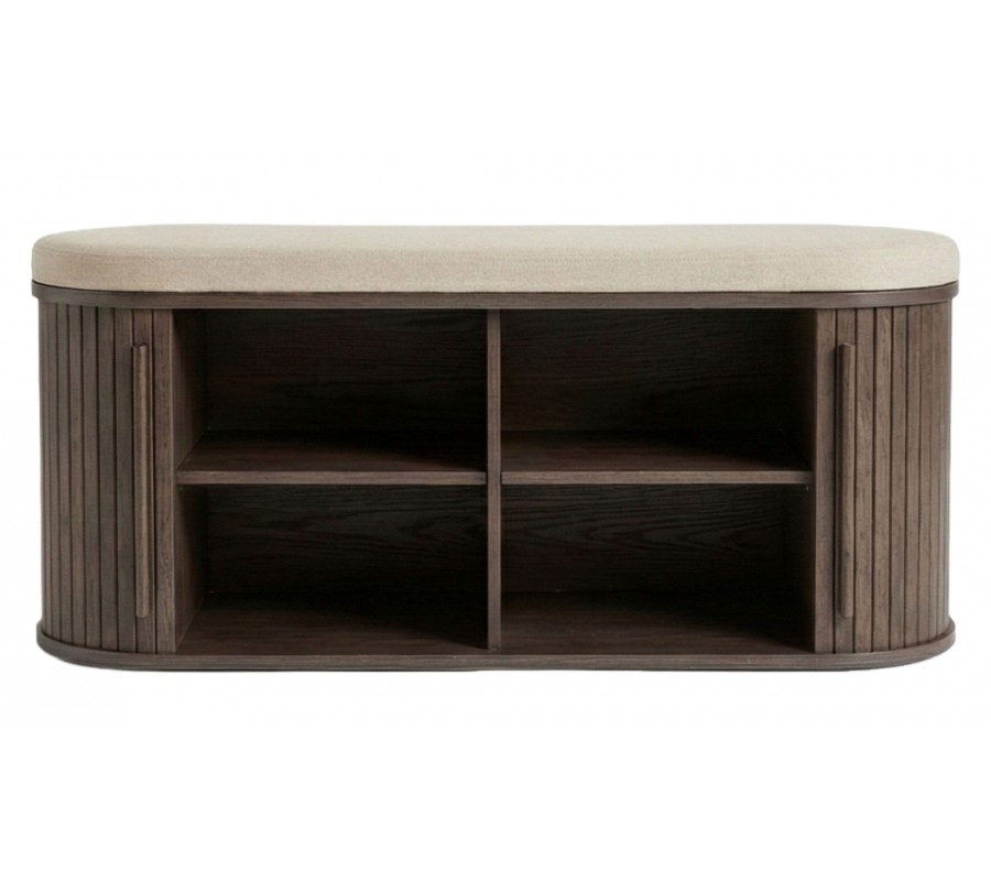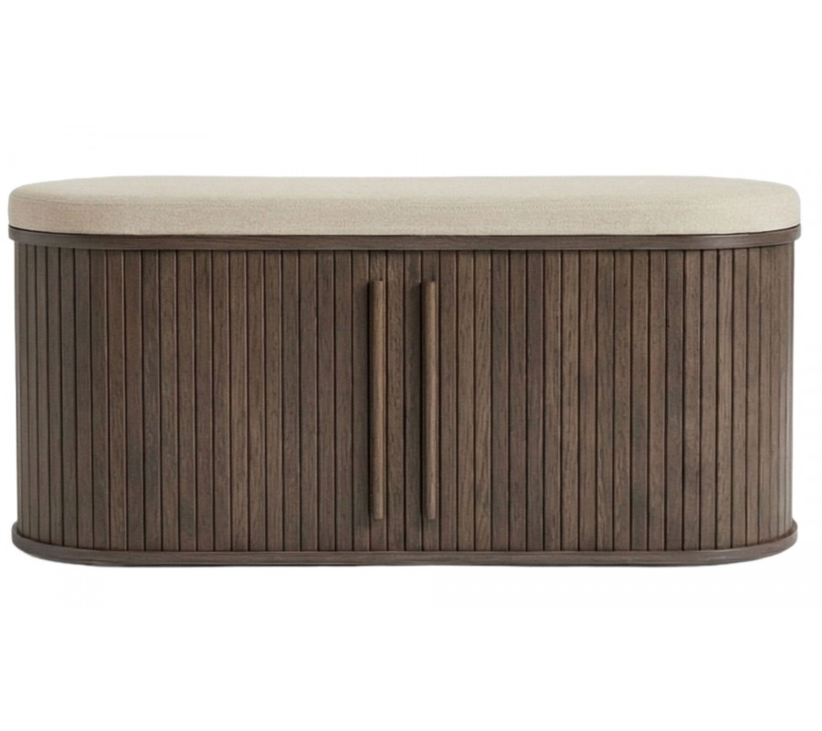 Retro oválna tmavá hnedá lavica Alborg s úložným priestorom a lamelovým dizajnom s béžovým čalúneným sedadlom 120 cm