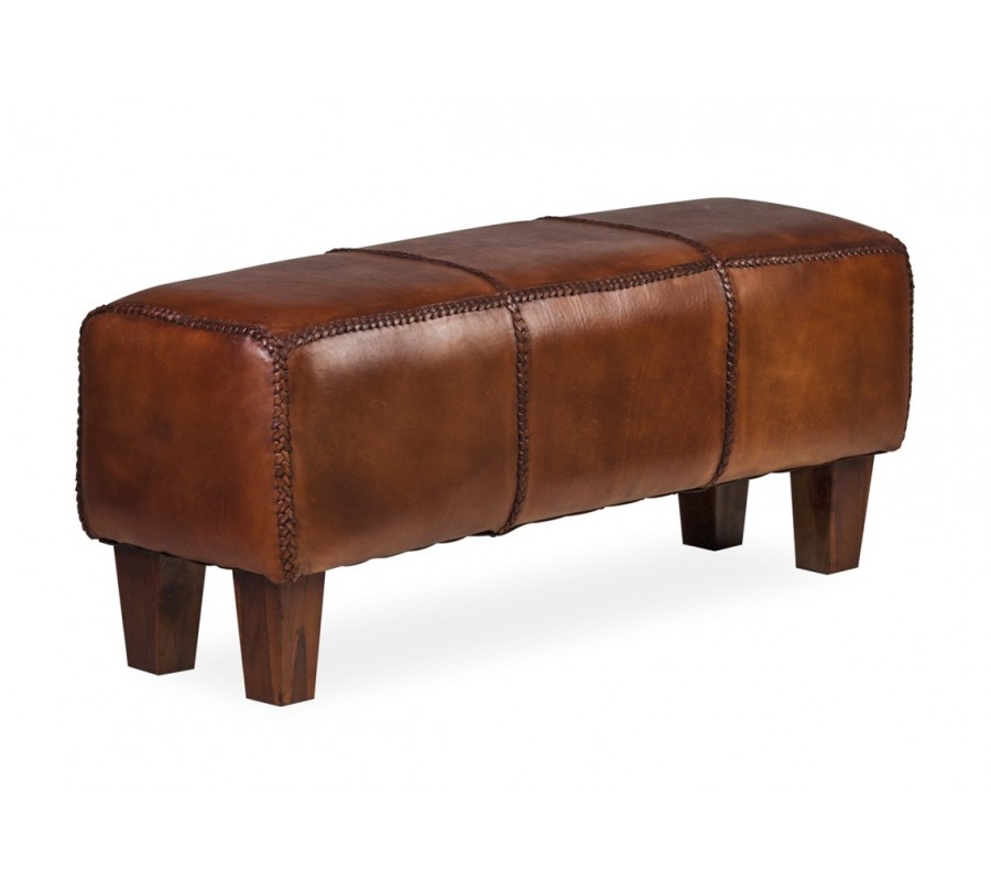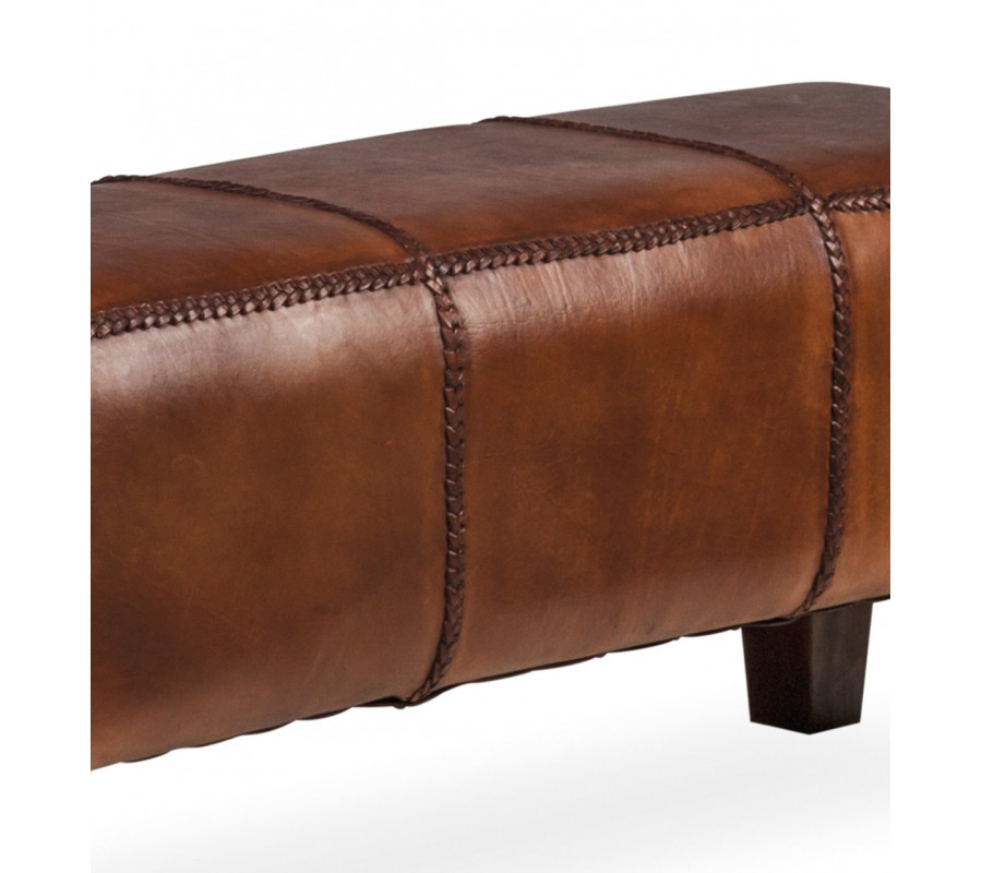 Konštrukcia lavice, vrátane odhalených nožičiek, je vyrobená z masívneho teakového dreva v bohatej hnedej farbe s červenými podtónmi a tmavšou kresbou letokruhov. Sedacia časť je pokrytá poťahom z pravej kože v teplom koňakovo hnedom odtieni. Hrany zdobí výrazné prešívanie s vrkočovým vzorom. Rovnaké prešívanie tiež prechádza v dvoch pásoch cez vrchnú, prednú a zadnú stranu a lavicu symetricky vizuálne predeľuje na tri časti.