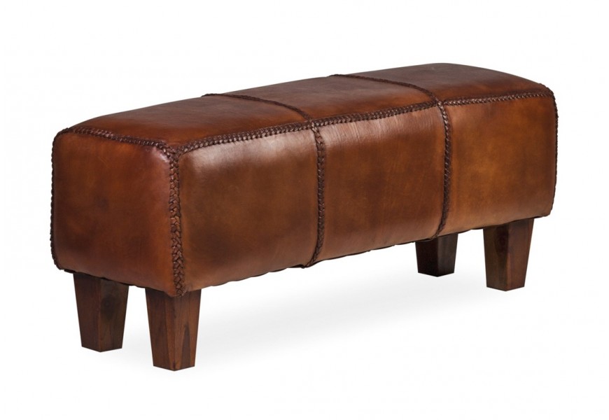 Dizajnová koloniálna lavica Trenza s koňakovo hnedým poťahom z pravej kože a teakovými nožičkami 110 cm