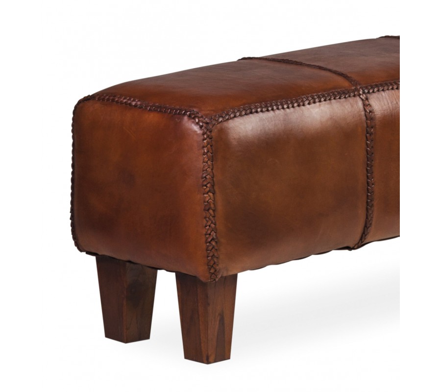 Konštrukcia lavice, vrátane odhalených nožičiek, je vyrobená z masívneho teakového dreva v bohatej hnedej farbe s červenými podtónmi a tmavšou kresbou letokruhov. Sedacia časť je pokrytá poťahom z pravej kože v teplom koňakovo hnedom odtieni. Hrany zdobí výrazné prešívanie s vrkočovým vzorom. Rovnaké prešívanie tiež prechádza v dvoch pásoch cez vrchnú, prednú a zadnú stranu a lavicu symetricky vizuálne predeľuje na tri časti.