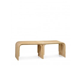 Moderná masívna lavica Hiberto s dizajnovou opierkou z teakového dreva v svetlej hnedej farbe 150 cm