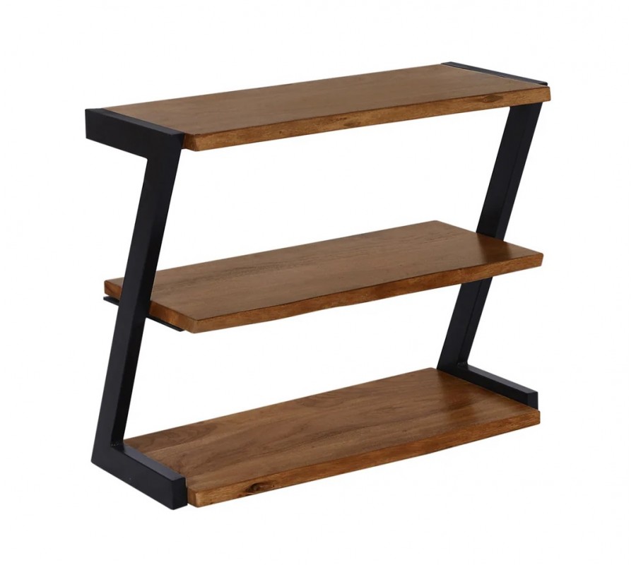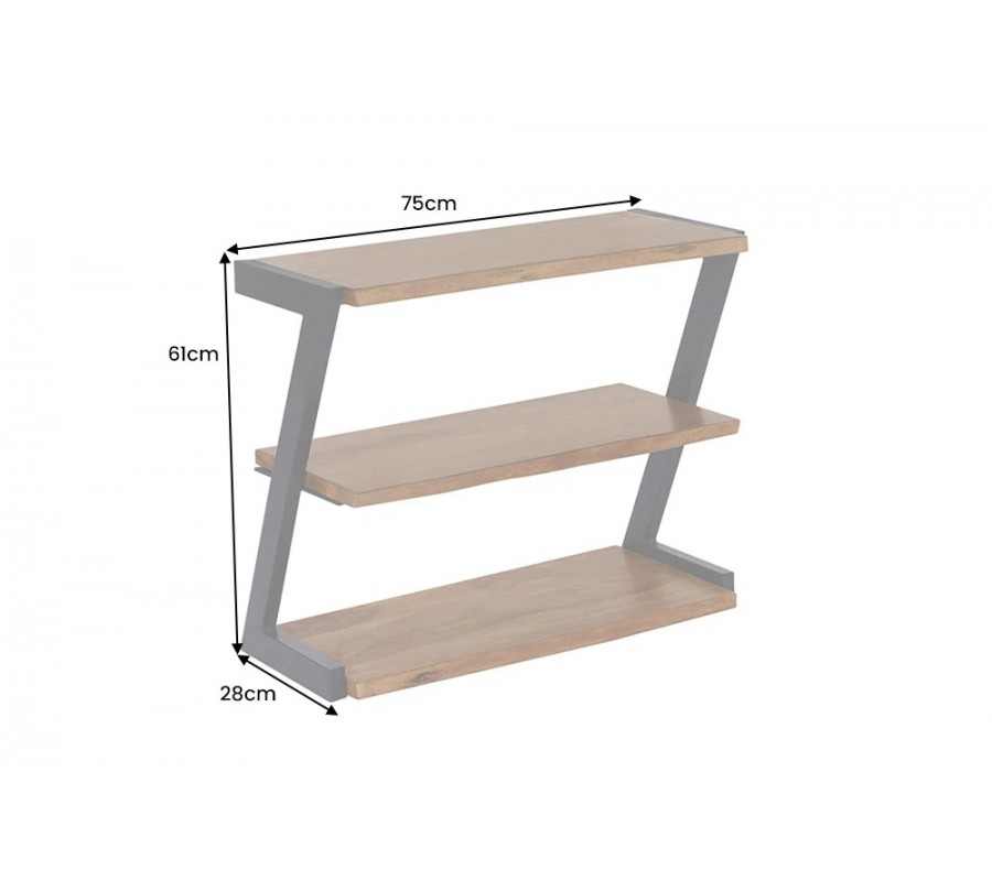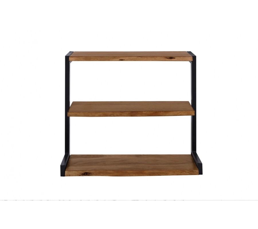 Tvorí ho stabilná kovová konštrukcia v matnej čiernej farbe, ktorá rámuje tri priestranné police z masívneho akáciového dreva. Drevo má teplý prirodzený odtieň so zvýraznenou kresbou, vďaka čomu pôsobí útulne a príjemne dopĺňa robustný vzhľad kovu.