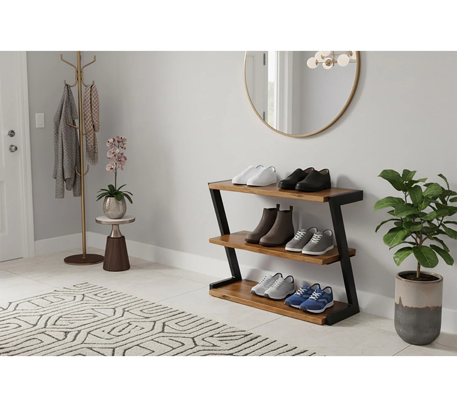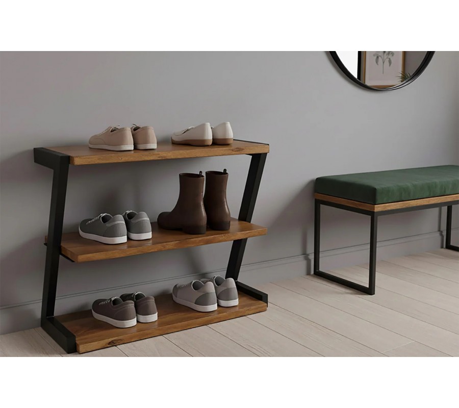 Bočnice botníka sú vytvorené z kovových profilov, ktoré sú charakteristicky zalomené do dynamického tvaru pripomínajúceho písmeno Z. Tento detail dodáva nábytku industriálny charakter a zároveň zabezpečuje maximálnu pevnosť. Tri otvorené police bez nožičiek poskytujú dostatok miesta pre uloženie približne šiestich párov obuvi, či už ide o tenisky, elegantné topánky alebo členkové čižmy. Otvorená koncepcia umožňuje rýchly prehľad aj jednoduchú cirkuláciu vzduchu, čo je pri obuvi mimoriadne praktické.