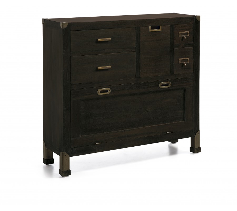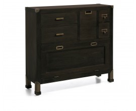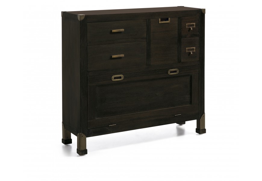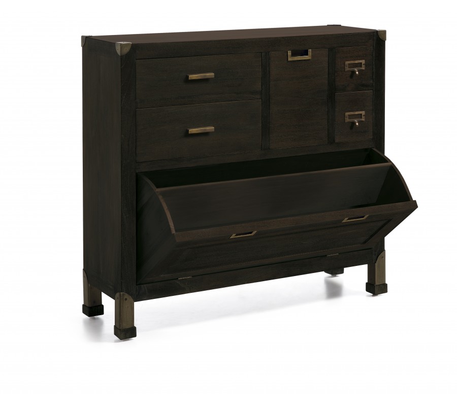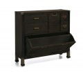 Luxusný štýlový botník s piatimi zásuvkami z kolekcie M-INDUSTRIAL je vyrobený z masívneho koloniálneho dreva MINDI. Kovové rohové prvky, rukoväte a nožičky dodávajú nábytku zaujímavý industriálny nádych. Čierna farba je univerzálna a dá sa ľahko kombinovať. Hodí sa naozaj všade a zaručene obohatí aj váš industriálny interiér! Botník disponuje viacerými praktickými zásuvkami a vyklápacími dvierkami, ktoré vám poskytujú dostatočný úložný priestor na vašu obuv. Odporúčame taktiež kombinovať s ďalšími kúskami z našej kolekcie M-INDUSTRIAL.