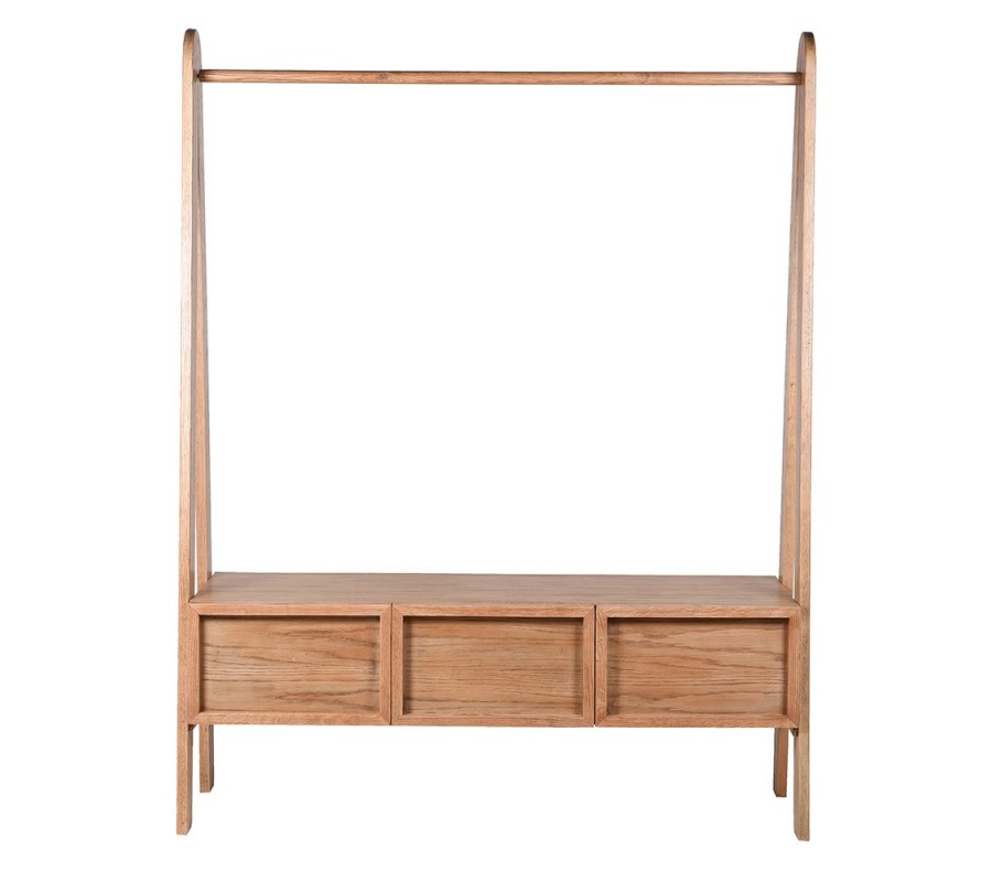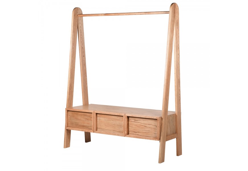 Štýlový dubový vešiak Amber so zásuvkami je nádherným príkladom rustikálneho štýlu. Robustné bočné rozširujúce vysoké nohy dodávajú nábytku stabilitu a vytvárajú zaujímavý dizajnový prvok. Nohy vyčnievajú nad vrchnú časť, kde sa nachádza vešiaková tyč na zavesenie odevov. Pod vešiakom sú tri priestranné zásuvky, ktoré poskytujú praktický úložný priestor. Vešiak je vyrobený z dubového dreva a jeho povrch je jemne opracovaný tak, aby vynikla prirodzená textúra a kresba dreva, pričom zachováva jemné nedokonalosti, čo mu dodáva autentický rustikálny vzhľad. Povrch je ošetrený matným povrchovým lakom, ktorý zdôrazňuje prírodné tóny dreva a zároveň poskytuje ochranu proti opotrebovaniu. Jednoduché línie a minimalistický dizajn zásuviek a nožičiek spájajú funkčnosť s estetickým pôvabom, vďaka čomu sa skvele hodí do vidiecky ladených interiérov, kde vytvára teplý a útulný dojem.