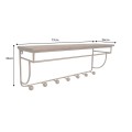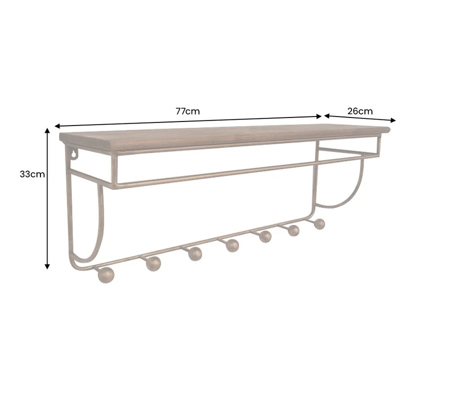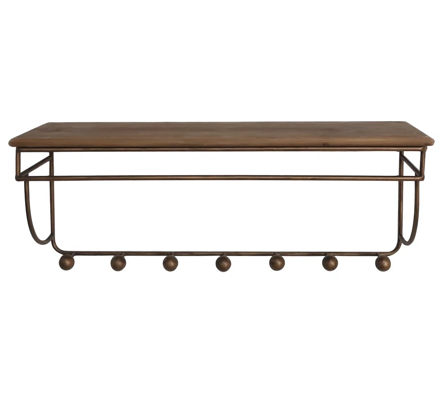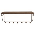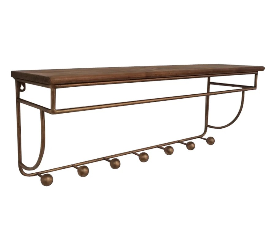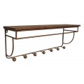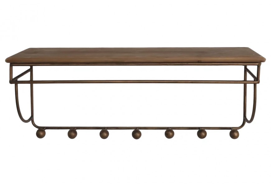 Štýlový drevený industriálny nástenný vešiak Herr s poličkou v hnedej farbe s kovovým dekorom v bronzovej farbe 77 cm