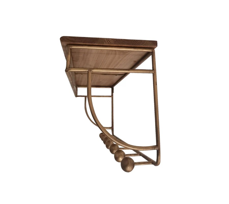 Vešiak Herr má obdĺžnikový tvar s policou z masívneho dreva v prírodnom hnedastom odtieni, ktorý zdôrazňuje autentickú textúru dreva. Okolo police sa nachádza kovová konštrukcia v tmavom bronzovom odtieni. Kovové prvky majú elegantne zaoblené hrany a pod poličkou sú vybavené praktickými guľatými háčikmi na zavesenie kabátov, tašiek alebo doplnkov.