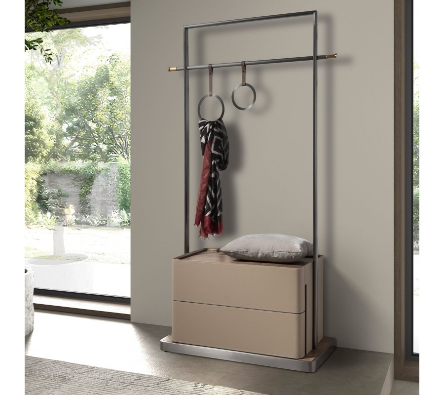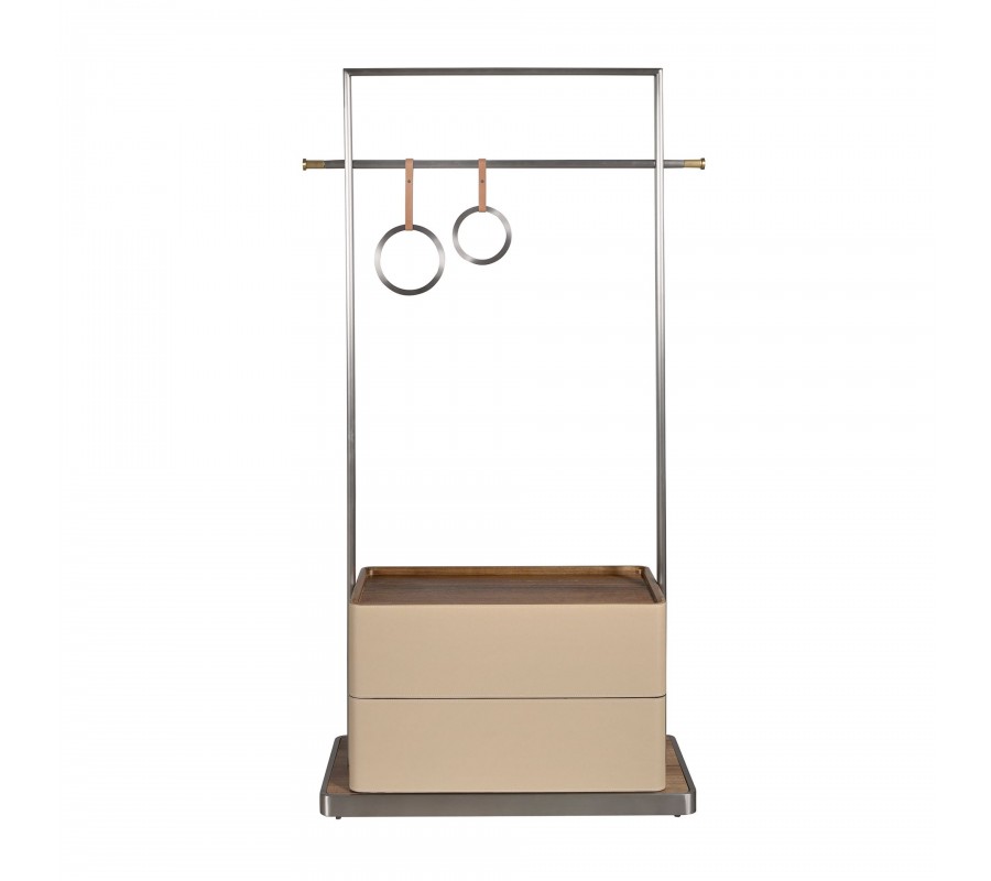 Podstava je olemovaná sivým kovom, ktorý sa vizuálne prepája s vysokým obdĺžnikovým rámom. Je vyrobený z nehrdzavejúcej ocele a v jeho vrchnej časti je upevnená tyč na zavesenie vešiakov. Pomocou hnedých kožených popruhov sú na nej zavesené dve kruhové úchytky v rôznych výškach, ktoré poskytujú dodatočný závesný priestor a tiež vytvárajú zaujímavý asymetrický dizajnový detail. Vešiaková tyč na stranách presahuje líniu rámu a je ukončená zlatým kovovým akcentom.