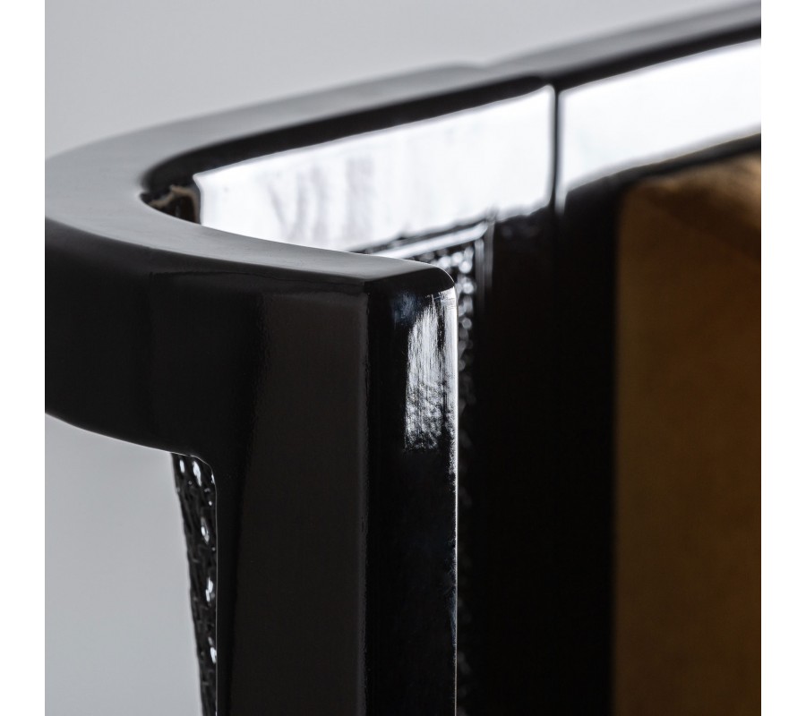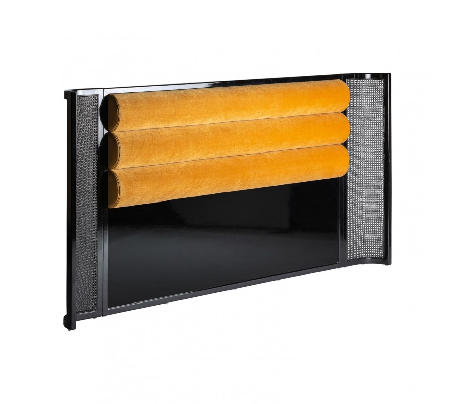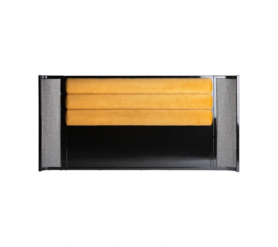 Zadné čelo posteľe Bellow v čiernej farbe si vás zaručene získa svojím nevídaným prevedením a svojími zaujímavými vlastnosťami. Čierne dizajnové vyhotovenie čela je doplnené horčicovo žltým zamatovým čalúnením v podobe troch horizontálnych línií pri samotnom vrchu čela Bellow. Táto farebná kombinácia je veľmi nevídaná, preto je čelo Bellow veľmi jedinečným kúskom, ktorý sa nesie v art-deco štýle. Dizajnové prevedenie avšak nieje jediným dôvodom, prečo je čelo Bellow tak unikátne. Okrem svojho štýlového dizajnu sú súčasťou čela aj odnímateľné ratanové bočné strany v zaoblenom tvare v čiernej farbe. Táto kombinácia dodá čelu Bellow majestátnejší a unikátnejší vzhľad, ktorý odporúčame kombinovať s čiernym nábytkom v art-deco štýle so zamatovými kreslami a sedačkami v horčicovo žltej farbe.