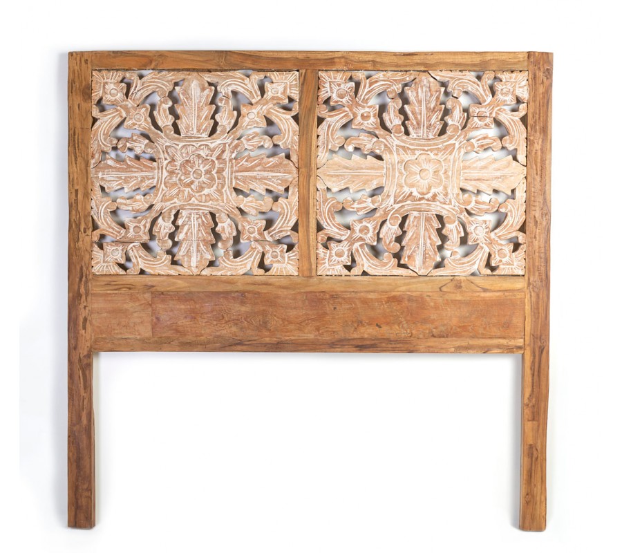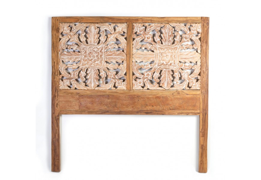 Koloniálne pôsobiace čelo postele Talia z teakového dreva, ručne vyrezávaným dekorom s ošúchaným náterom a dvomi nožičkami 165cm