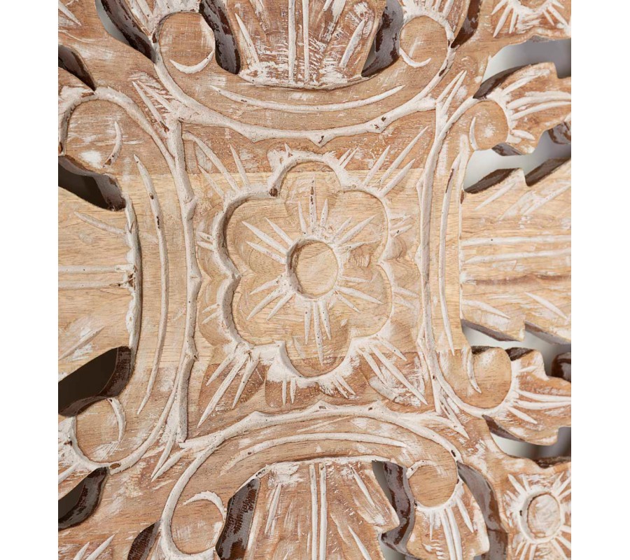 Túžite po exotike v pohodlí vášho domova? Prebúdzať sa do atmosféry cudzokrajných kultúr vám jednoducho zabezpečí unikátne čelo postele Talia vyrobené z teakového dreva. Exoticky pôsobiace drevo konštrukcie čela prináša príval pozitívnej cestovateľskej energie a prenesie vás do sveta exotiky a spirituálneho rozvoja východných kultúr. Orámovanie čela spolu s nožičkami je tvorené hrubším mangovo hnedým drevom s výraznou štruktúrou a jedinečnou kresbou. Ručne vyrezávané ornamenty sú rozdelené na dva samostatné bloky s originálnym neopakovateľným rukopisom. Jednotlivé línie vyrezávania vyniknú aj vďaka povrchovej úprave bielym matným náterom, ktorý je výrazne ošúchaný a dodáva kúsku nostalgický nádych. Čelo postele Talia sa bude skvelo vynímať v spálni zariadenej v koloniálnom štýle s etno prvkami, masívnymi svetlými komodami, ratanovými prvkami a hnedým koženým otomanom.