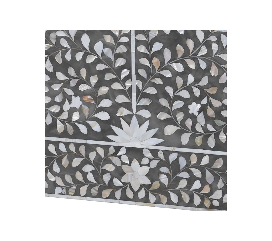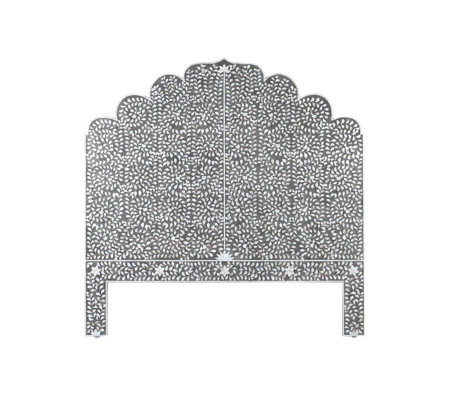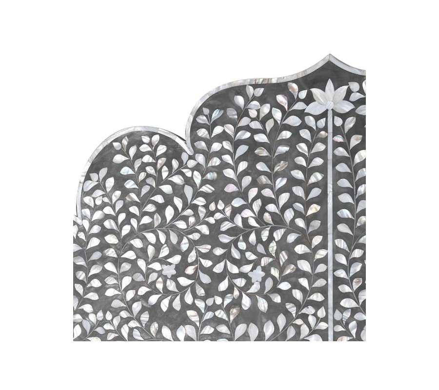 Exkluzívne čelo postele Lorelai sa vyznačuje svojím originálnym dizajnom a inovatívnou materiálovou kombináciou. Čelo sa nesie v sivej a striebornej farbe a je vyrobené z kombinácie dreva, perlete a živice. Povrchová úprava čela je zdobená jemnými prírodnými ornamentami v tvare listov bielej perleťovej farby. Bohatá výzdoba je vyrobená tradičnou ručnou technikou indických majstrov s typickými znakmi tohto umenia. Čelo tiež zaujme svojím tvarom, ktorý je na vrchu zdobený oblúkovitým vzorom inšpirovaným kopulami orientálnych mešít. Vďaka jeho bohatému zdobeniu možno čelo Lorelai doplniť do orientálne ladených spální. Originálny dizajn bude pôsobiť luxusným dojmom a nádherne doplní váš interiér.