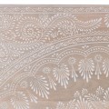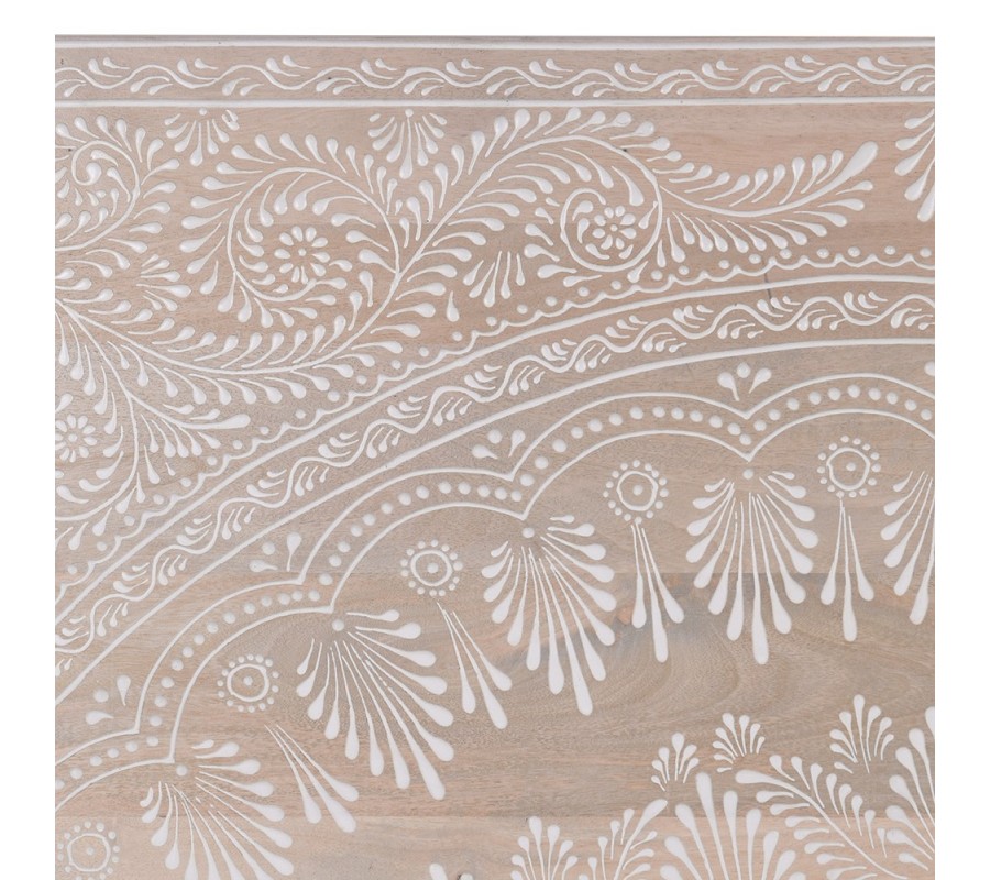 Etno čelo postele Saraswati prinesie do vašej spálne mágiu orientu. Je vyrobené z masívneho mangového dreva v svetlej farbe a ozdobené ručne maľovanou bielou mandalou. Tento symbol pochádza z Indie a spája s tradičnými obradmi a slávnosťami, pri ktorých sa tieto nádherné zložité obrazce tvorili zo zafarbeného piesku a na následne, na konci slávnosti, vždy rozprášili do vetra. Mandaly v sebe harmonicky spájajú geometrické tvary kruhu, ktorý zosobňuje nekonečno a transcendenciu a štvorca, ktorý zosobňuje vnútorné sily človeka a všetko späté so zemou. Motívy zložené z geometrických tvarov a prírodných vzorov prenikajú aj do moderného dizajnu a v súčasnej uponáhľanej dobe tak môžu priniesť do vášho domova východnú harmóniu a duchovnosť. Umiestnenie mandaly na čelo postele je ideálnou voľbou, či už vďaka jej symbolizmu, alebo estetickej hodnote. Zložitý vzor sa začína v kruhových vrstvách odvíjať zo strednej časti čela postele. Štvorcový tvar tvorí pomyselný rám pre toto dielo a rohy sú vyplnené bohatou ornamentáciou. Čelo postele sa hodí k základni so svetlého dreva a je to ideálny spôsob, ako oživiť vašu spálňu bez toho, aby ste museli vymeniť celú posteľ. Ideálnymi doplnkami sú pestré vzorované textílie, ako napríklad vankúš, či koberce, alebo ďalší orientálny nábytok. Motív vychádzajúci z indickej tradície si priam vyžaduje ďalšie doplnky v etno štýle a živé zelené rastliny, ktoré pomôžu vašu spálňu premeniť na skutočnú oázu pokoja a harmónie, do ktorej sa budete každý večer tešiť.