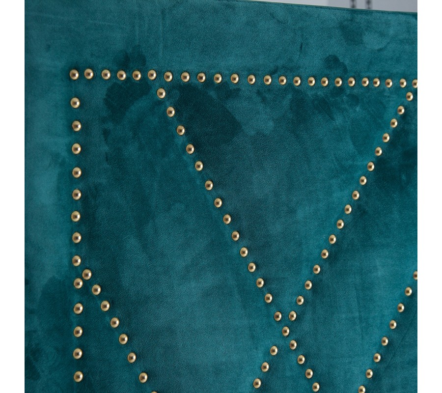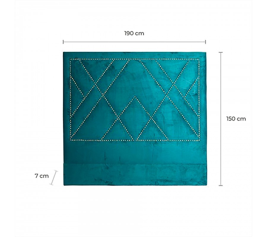 Luxusné čelo postele Azure oživí vašu spálňu žiarivou tyrkysovou farbou a luxusom art deco štýlu. Vďaka svojej šírke 190 cm je vhodné na umiestnenie k manželským posteliam. Čalúnenie a zamatová poťahová látka vám zaručia pohodlné mäkké opretie. Silueta čela je jednoduchá obdĺžniková. Rovné línie korešpondujú s geometrickým zdobením, ktoré je tvorené okrúhlymi kovovými nity. Ich zlatá farba fantasticky dopĺňa nádherný tyrkysovo modrý odtieň zamatovej poťahovej látky, čo robí z čela postele Azure vhodný doplnok do spální zariadených v extravagantnom glamour štýle. V dizajne je obsiahnutá esencia art deco estetiky a vo vašej spálni ju môžete ešte zvýrazniť pridaním nočnej lampy s lesklou zlatou podstavou alebo nočným stolíkom s podobnými detailmi. Základňa postele môže byť čalúnená rovnakou tyrkysovou zamatovou látkou, no skvelou voľbou sú aj kontrastné farby, ako napríklad čierna alebo biela. Čelo postele je nie len praktickým a pohodlným doplnkom, ale vďaka svojmu prevedeniu bude tiež dominantným dekoračným prvkom vo vašej spálni.