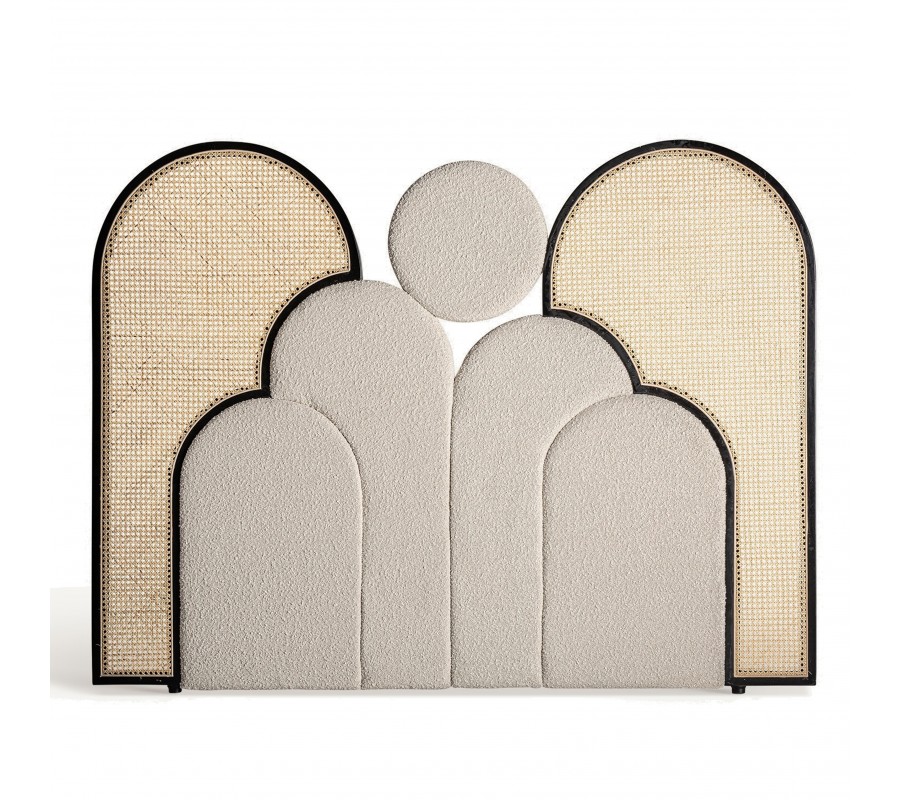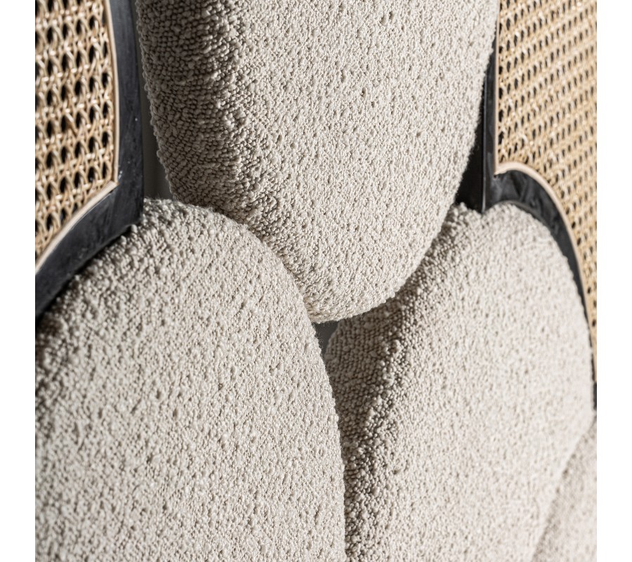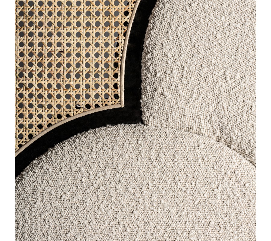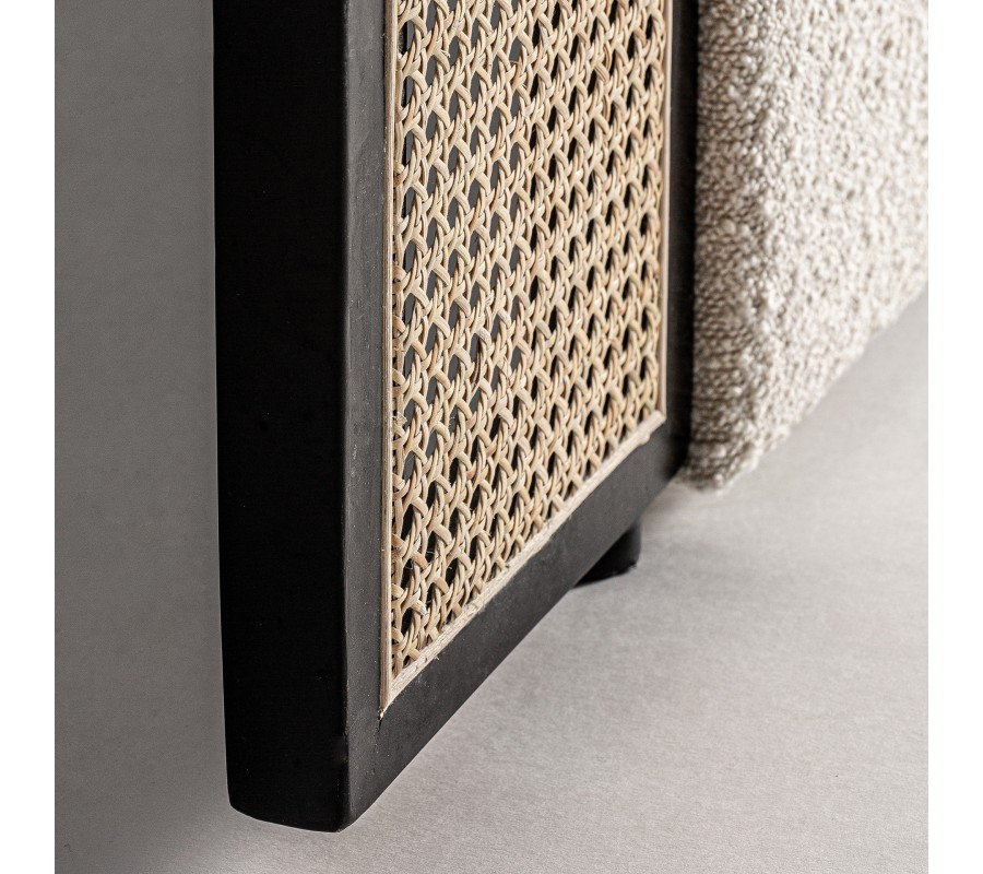 Kontrastná estetika pokračuje aj v stredovej časti čela. Penové čalúnenie vám zaručí pohodlné opretie a poťah z buklé látky je príjemný na dotyk. Dodáva čelu zaujímavú štruktúru a mäkký vzhľad. Tiež zdôrazňuje art deco charakter nábytku a dodáva mu luxusný nádych. Chladné tóny sivo bielej farby vytvárajú príjemný vizuálny protiklad k teplo pôsobiacemu ratanovému výpletu.