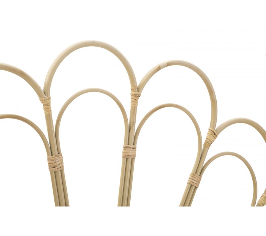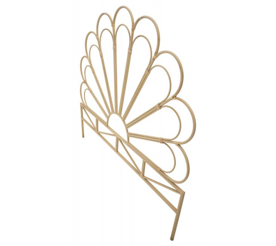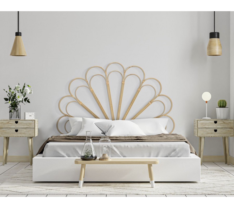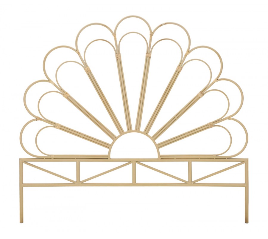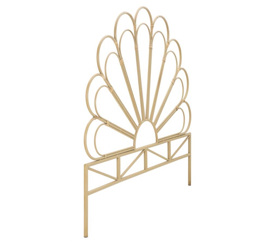 Čelo postele Lania v etno štýle je vyrobené z kovu, pričom jeho spoje sú omotané ratanom v svetlej hnedej farbe, čo mu dodáva autentický prírodný vzhľad. Dizajn pripomína kvet, ktorého oblúkové línie vytvárajú jemný a harmonický vzor, pričom pod týmto dekoratívnym prvkom sa nachádza obdĺžnikový rám, z ktorého vychádzajú nožičky zabezpečujúce stabilitu.